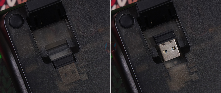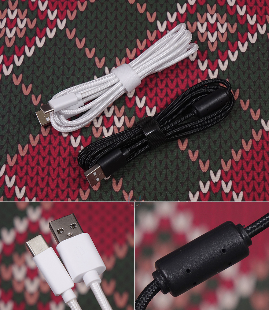 키보드 밑바닥 부분은 기본 색상 모델은 화이트로 불투명이지만, 클리어블랙 모델은 반투명으로 내부가 살짝 비치는 걸 확인할 수 있으며, 양쪽 앞부분에는 높낮이 조절 받침대가 적용되어 있는데, 왼쪽 받침대 아래에는 무선 2.4G 사용 시 이용되는 동글 수신기가 수납되어 있으며, 높낮이 받침대는 2단 조절입니다. 물론, 키보드 측면에서 보면 타이핑에 최적화라 부르는 스텝-스컬처 2 단계배열도 적용되어 있어서 높낮이 조절로 사용자가 좀 더 최적의 높이에서 타이핑할 수 있죠. 끝으로, 기본 제공되는 USB 전원케이블은 1.5m 길이에 전체 슬리빙 처리를 해놨으며, 기본 색상과 클리어블랙 색상에 맞춰 케이블 색상도 통일시켰으며, 인터페이스는 USB-C to A이고, USB-A 방향에 신호손실 최소화를 위한 노이즈필터도 적용되어 있습니다.