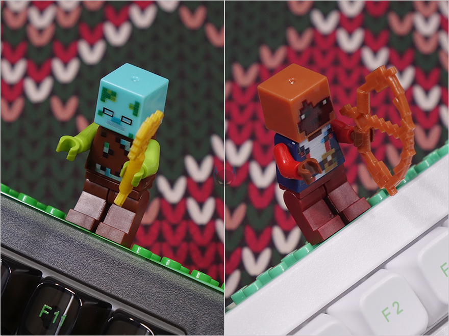 그리고, 이 키보드의 주요 특징 중 하나는 바로 키보드 전면에 장난감 블록/브릭 바(Bar)를 적용했습니다. 흔히 레고라고도 부르는 블록/브릭 장난감 기판을 적용하고 있는데, 측면에서 보면 단순히 기판만 적용한 게 아니라 ESC키가 있는 첫 줄 배열을 마치 타자기처럼 각도가 올라간 형태로도 적용하고 있죠. 참고로, 왼쪽 측면에는 무선 사용 시 전원 On/Off 스위치가 배치되어 있으며, 반대쪽 측면에는 유선/블루투스/무선 2.4G 연결모드 스위치가 배치되어 있습니다. 그리고, 브릭이 있는 위치 정확히는 ESC키 위치쯤에 USB 전원케이블과 연결되는 USB-C 포트가 배치되어 있죠. 또한, 브릭 기판에는 제품 색상마다 제공되는 장난감 브릭을 조립해서 꽂아놓을 수 있으며, 일반 블록/브릭 장난감도 조립해서 꽂아놓을 수 있습니다. 그리고, 기판도 분리가 가능하죠. 호환되는 브릭 기판이기 때문에 평소 블록/브릭 장난감을 좋아했다면 다양한 조립연출을 할 수 있습니다.