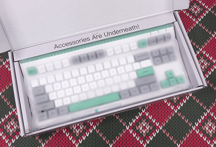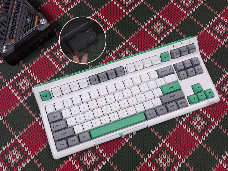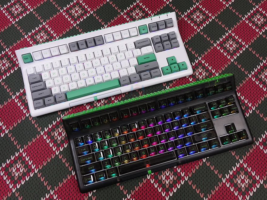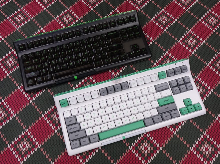 본격적으로 에포메이커 브릭 87 키보드를 살펴보면, 방금 언급했듯이 색상은 총 4가지로 출시했습니다. 3가지는 화이트를 기본 색상으로 키캡에 포인트를 주고 있으며, 나머지 1가지는 케이스부터 키캡까지 반투명의 클리어 블랙으로 적용되었죠. 키 배열은 모델명에서 이미 알 수 있듯이 전형적인 87 키 배열의 텐키리스입니다. 텐키리스 키보드지만 내부에 흡음재가 적용되었기 때문에 무게는 약 1.2kg대로 묵직하죠.