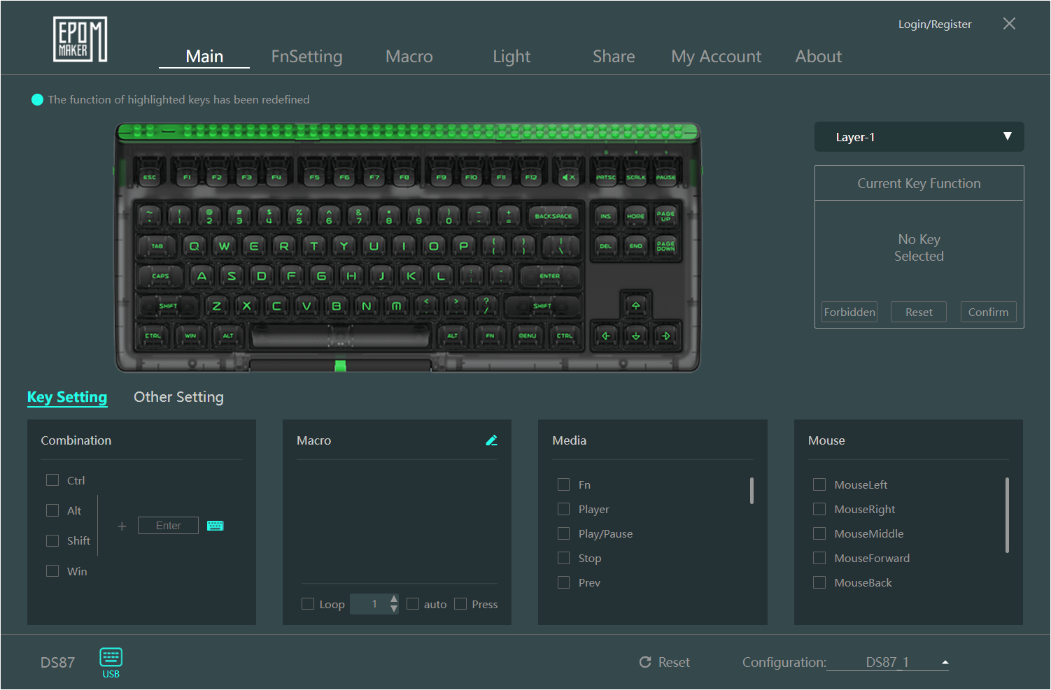 끝으로, 브릭 87 키보드 역시 에포메이커의 소프트웨어 지원을 하는데, 홈페이지에서 해당 소프트웨어를 다운로드 받아 실행하면, 인식된 브릭87 키보드 메인화면과 함께 총 7가지 메뉴를 확인할 수 있습니다. 먼저, 메인화면에서는 키 기능설정을 사용자가 원하는 대로 변경할 수 있는데, 매크로나 미디어, 마우스 기능으로 변경할 수 있죠. 이밖에 메인화면에서 추가로 무선 연결 대기시간도 설정할 수 있으며, 키 반응속도도 조절할 수 있습니다. Fn설정은 메뉴이름 그대로 Fn키 기능의 키들을 사용자가 원하는 기능으로 변경할 수 있습니다. 방법은 메인화면의 키 기능 설정과 똑같습니다. 그리고, 라이트 기능은 백라이트 기능으로 모드 선택부터 밝기, 속도조절을 할 수 있으며, 모드 선택은 Fn키 조합 모드 선택보다 좀 더 많이 지원하고 있으며, 키 개별 색상 설정도 가능합니다. 이밖에 매크로와 라이트 기능을 사용자마다 설정값을 공유할 수 있게 지원하고 있으며, 프로그램 시작 및 언어 설정도 가능한데, 아쉽게 한국어 지원을 없습니다.