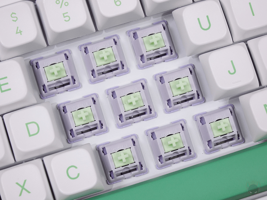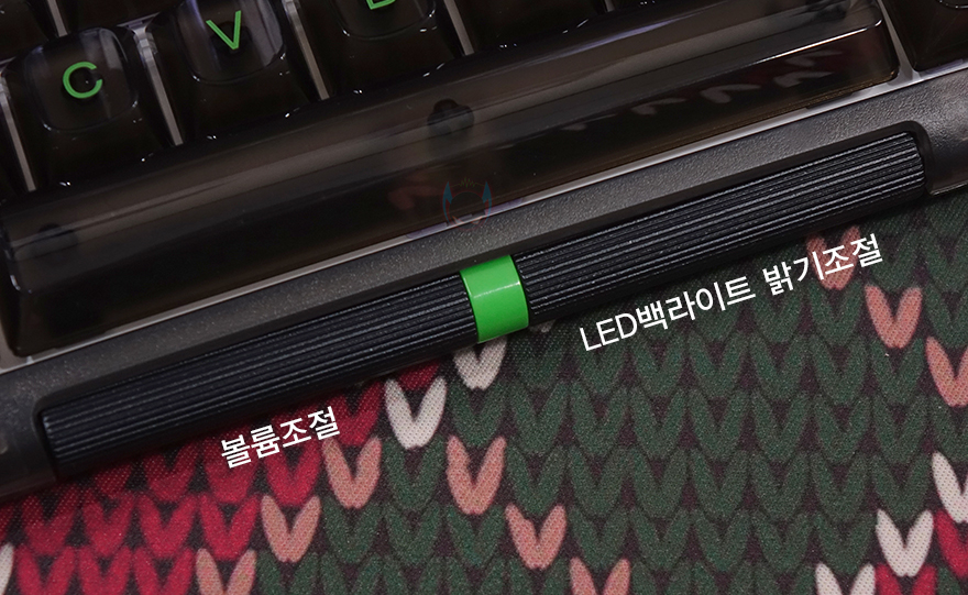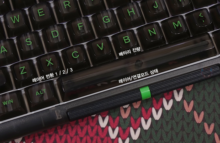 이 밖에 키 자판에서 맨 오른쪽 특수키 자리 맨 윗부분에는 Caplock, 무선 연결, 충전 상태를 확인할 수 있는 LED 인디케이터가 배치되어 있으며, F12키와 PrintScreen 키 사이에는 독립 실행으로 사용할 수 있는 음소거 키가 배치되어 있습니다. 또한, 스페이스-바 아래에는 가운데 색상구분 기준으로 양쪽 휠이 적용되어 있는데, 왼쪽은 볼륨조절, 오른쪽은 LED 백라이트 밝기 조절을 할 수 있습니다. 물론, 뒤에서 다시 언급하겠지만, Fn키 조합으로도 지원합니다. 그리고, 키캡은 PBT재질에 기본 색상 모델과 클리어블랙 차이를 두고 있으며, 키캡 높이도 클리어블랙이 좀 더 높습니다. 스위치는 구입 시 선택할 수 있으며, 리뷰에선 에포메이커의 대표적인 리니어 타입인 Wisteria 스위치를 적용하고 있으며, 핫스왑 방식으로 분리가 가능하고, 스위치 PCB 기판이 5 핀이라 3핀과 5핀 모두 호환이 가능합니다. 또한, 스위치 플레이트와 PCB 기판 사이에 폼, 패드, PCB기판 아래에 패드와 폼까지 총 4중으로 흡음재를 적용하고 있습니다. 그리고, Mac용으로 사용 시 Win, Alt 키캡을 OPT, CMD 키캡으로도 변경할 수 있죠.