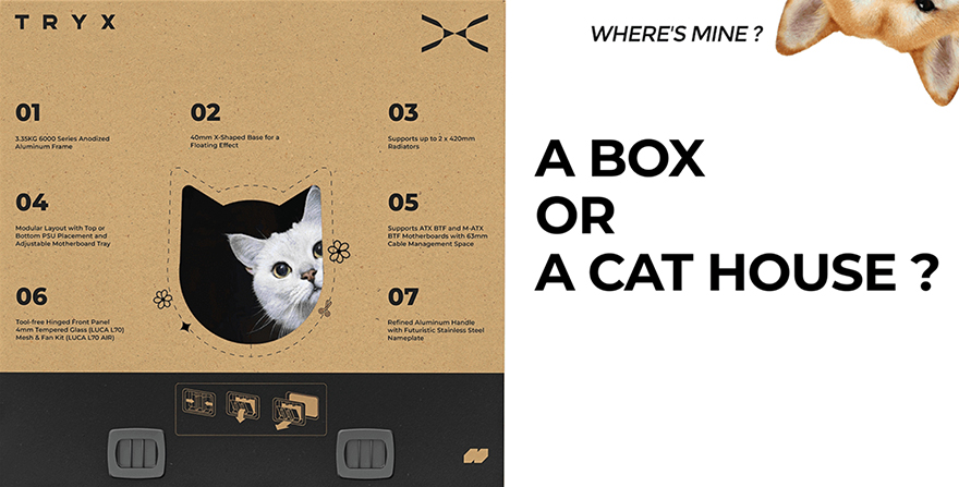 제품 박스부터 살펴보면, LUCA L70는 뒤에서 다시 확인하겠지만, 미들타워 PC케이스임에도 제법 큽니다. 그래서, 제품 박스부터 일반 미들타워보다 큰 편이고, 재질 때문에 무게도 일반 미들타워에 비해 상당히 무거운 편이죠. 박스 전면에는 제품 일부 이미지를 담으면서 모델명을 확인할 수 있고, 아래에 제품 박스 잠금장치와 함께 해제 방법을 표시해 놨는데, 사실 이런 형태의 제품 박스를 국내에선 좀처럼 보기 드물죠. 보통 이런 박스 포장은 제품이 상당히 무겁거나 해외시장에선 글로벌 배송 시 적용되는 경우인데, LUCA L70은 전작에 해당되는 사항으로 꽤 무겁습니다. 그리고, 후면에도 역시 제품의 주요 특징 언급과 함께 잠금장치를 확인할 수 있고, 가운데 제품 박스를 캣-하우스로 재활용할 수 있는 용도로도 표시하고 있죠. 또한, 주요 특징 표기에서 이 제품의 무게가 일반 미들타워보다 무거운 이유를 알 수 있는데, 바로 첫 번째로 표기하고 있는 케이스 재질 일부가 알루미늄이 사용되었기 때문입니다. 이 부분은 뒤에서 좀 더 자세히 언급하고, 이 밖에 40mm 높이의 X형 받침대, 최대 420mm 라디에이터 듀얼 배치, 파워서플라이 위치변경, BTF 메인보드 지원, 강화유리 패널, 알루미늄 손잡이의 스테인리스 네임플레이트를 확인할 수 있죠.