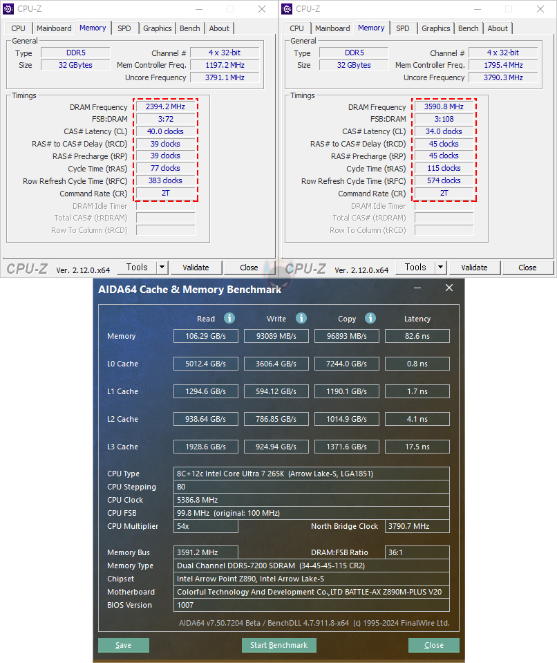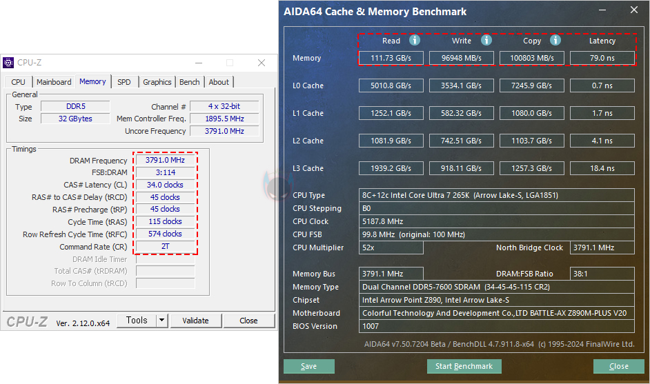 그리고, Battle-AX Z890M-Plus V20 메인보드에서 지원하는 하드웨어별로 기능 및 성능을 확인해보면, 먼저 CPU 같은 경우 리뷰에선 인텔 코어 울트라 7 265K CPU를 사용했으며, Cinebench R23를 실행해 본 결과 멀티코어는 약 35000점 중반대, 싱글코어는 약 2200점 후반대로 여러 미디어 사이트들의 벤치마크 결과값과 비슷합니다. 즉, CPU 성능을 제대로 발휘했다는 거죠. 참고로, Battle-AX Z890M-Plus V20 메인보드는 Z890칩셋 기반이기때문에 당연히 CPU 오버클럭도 지원을 하는데, 앞서 확인한 CMOS 메뉴에서 Advanced Mode를 선택해 OC와 Advanced 메뉴에서 CPU 오버클럭에 관련된 설정값들을 다룰 수 있습니다. OC에선 Frequency Setting, CPU Power Setting, Volatge Setting에서 배수 및 전력 설정 등을 할 수 있으며, Frequency Setting 메뉴에서 OverClocking Feature 설정을 활성화(Enabled) 시켜야 세부 설정들이 나타납니다.