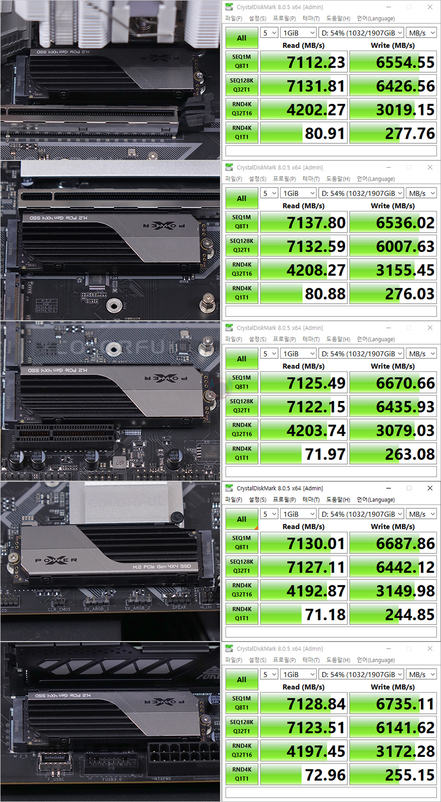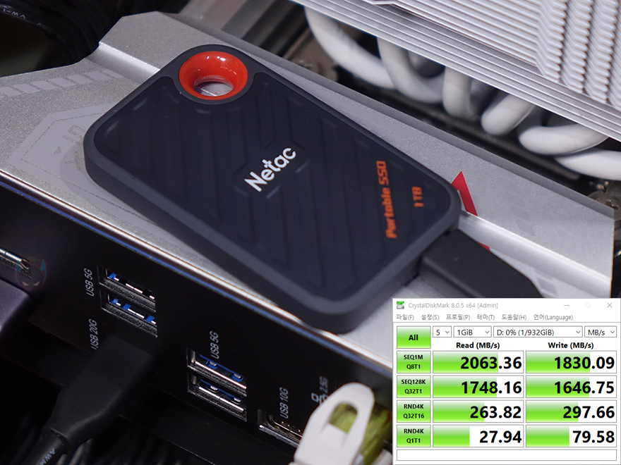 이번엔 저장장치 지원에 대해서 확인해보면, Battle-AX Z890M-Plus V20 메인보드 같은 경우 앞서 레이아웃에서 확인했듯이 총 5개의 M.2 SSD 슬롯을 갖추고 있습니다. 다시 말해, 총 5개의 SSD를 장착할 수 있는 거죠. 그리고, M.2 SSD 1번 슬롯은 PCIe 5.0x4 규격까지 지원하며, 나머지 4개의 슬롯도 모두 PCIe 4.0x4 규격을 지원합니다. 그래서, PCIe 4.0x4 규격의 NVMe SSD를 각 슬롯에 장착해 읽기와 쓰기 속도를 측정해 보면, 5개의 슬롯 모두 비슷한 수치를 보여줬으며, PCIe 4.0x4 규격에서 볼 수 있는 최대 읽기 7000MB/s대와 최대 쓰기 6000MB/s를 확인할 수 있습니다. 그리고, 백패널 I/O 포트에는 USB 3.2 Gen2x2 타입 C 포트 1개를 갖추고 있는데, 이 역시 USB 3.2 Gen2x2 지원 외장 SSD를 사용하면 최대 속도 2000MB/s 대 발휘를 확인할 수 있죠.