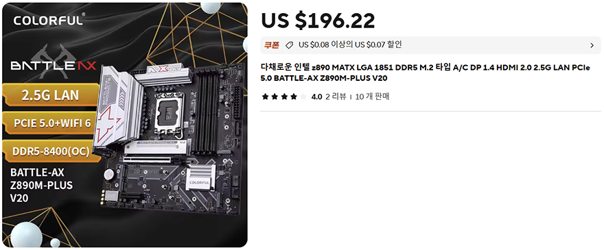 끝으로, 컬러풀(Colorful)은 하반기부터 국내 소비자들이 해외직구로 많이 사용하고 있는 알리익스프레스에 공식스토어(https://ko.aliexpress.com/store/1103792176)를 입점했습니다. 이부분은 이미 앞서 다른 컬러풀의 메인보드 리뷰에서도 꾸준히 언급했는데, 글로벌 스토어라서 최신 컬러풀 메인보드를 가장 빠르게 접할 수 있습니다. 그래서, Battle-AX Z890M-Plus V20 메인보드 역시 공식스토어에서 판매 중인데, 가장 큰 매력은 역시 가격입니다. 물론, 알리익스프레스 같은 경우 매월 할인 프로모션을 진행하기 때문에 평소 가격보다 저렴하게 구매할 수 있는데, 평균적으로 Battle-AX Z890M-Plus V20 메인보드는 150~160달러선에서 구매가 가능합니다. 이는 국내에서 가장 저렴한 Z890 메인보드보다 약 10만원이상정도 차이가 나며 더 저렴하죠. 그래서, 보급형 Z890 메인보드로는 끌릴 수밖에 없습니다.