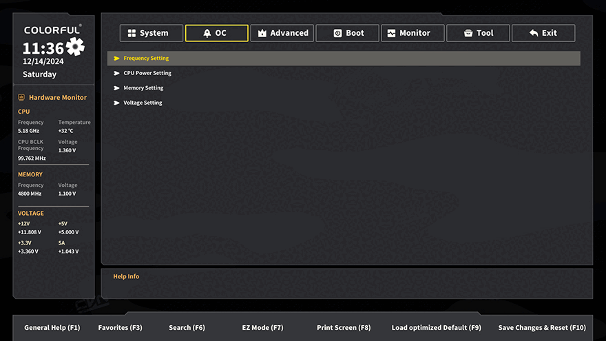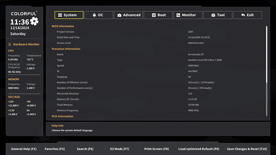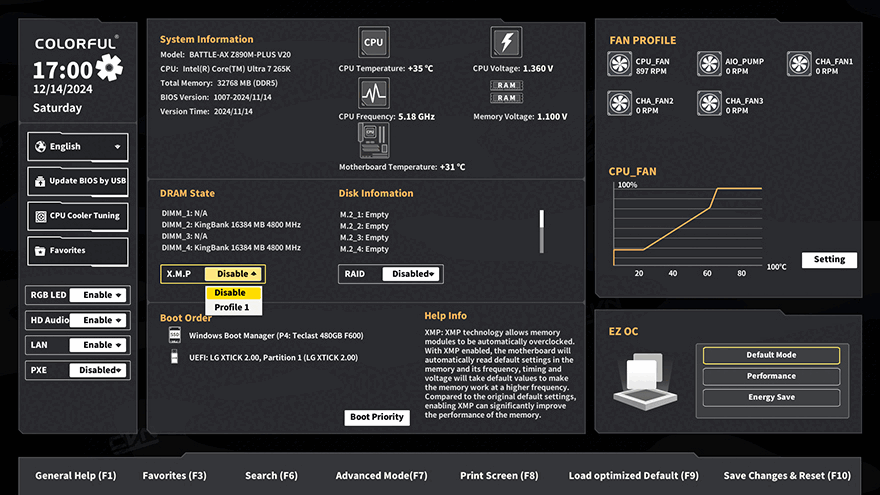 직접, 컬러풀 Battle-AX Z890M-Plus V20 메인보드를 사용해보면, 먼저 바이오스 CMOS를 잠깐 살펴보면 일단 인터페이스 디자인이 완전히 바뀌었습니다. 정확히는 이제 흔히 말하는 4대 메이저 메인보드 회사들이 적용하고 있는 인터페이스 형식으로 적용된 거죠. 참고로, 최신 바이오스로 업데이트하면 색상 부분까지 좀 더 깔끔하게 변경된 인터페이스를 볼 수 있습니다. 그리고, 기본화면에서 4대 메이저 메인보드 제품들처럼 컬러풀도 이제 EZ Mode와 Advanced Mode로 전환할 수 있는데, 일단 EZ Mode라 할 수 있는 기본화면에서는 한눈에 시스템 상태와 메모리, 팬, 부팅, RGB, 바이오스 업데이트, 언어 설정 등을 한눈에 확인하고 설정할 수 있습니다. 경쟁사들보다 훨씬 심플한 배경을 적용하고 있어서 보기에도 깔끔하죠. 또한, EZ Mode에선 CPU Cooler Tuning 메뉴가 있는데, 장착한 쿨러 종류에 따라서 CPU PL1, PL2 전력설정을 자동으로 적용할 수 있습니다. 쉽게 말해, 인텔에서 코어 울트라 2 시리즈 CPU를 출시하면서 언급했던 성능 퍼포먼스에 대한 프로파일 제공을 CPU Cooler Tuning 메뉴에 적용한 거라고 보면 됩니다. F7키를 통해 전환할 수 있는 Advanced Mode는 다른 메인보드에서도 흔히 볼 수 있는 세부설정의 메뉴들 System, OC, Advanced, Boot, Monitor, Tool, Exit를 확인할 수 있습니다. OC는 CPU/메모리 오버클럭 관련을 설정할 수 있으며, Advanced에선 전력, 저장장치 등 메인보드에 연결되는 전반적인 하드웨어 설정을 다룰 수 있습니다.