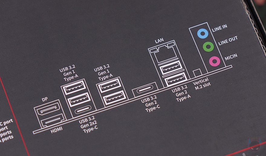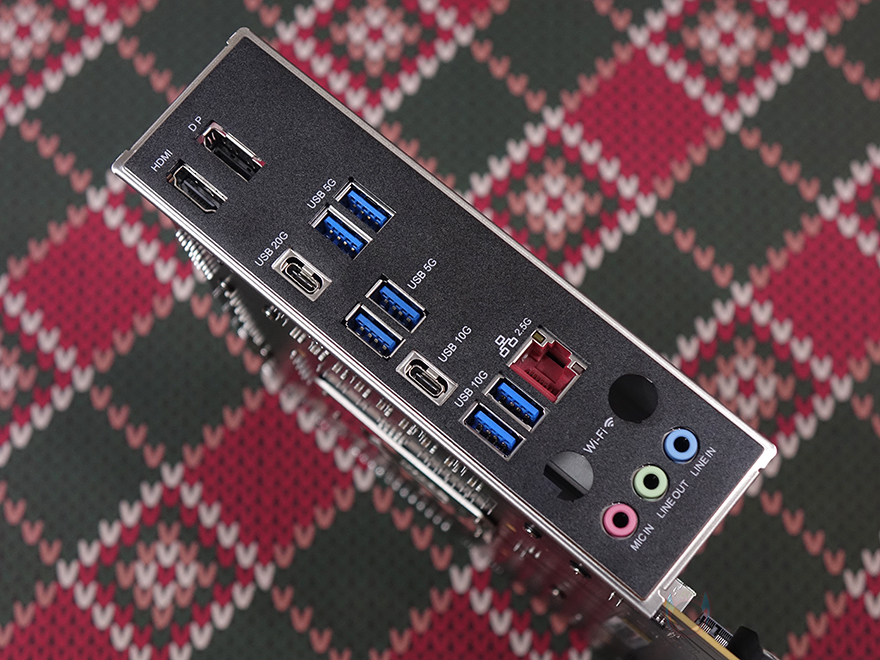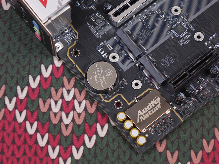 그리고, 메인보드 맨 왼쪽 백패널 I/O 자리 바로 아래에는 다른 메인보드 제품들과 마찬가지로 내장 오디오가 배치되어 있으며, 독립된 PCB 구간으로 처리했으며, 고주파음 최소화를 위해 EMI 실드도 적용했습니다. 끝으로, 백패널 I/O 포트 구성을 확인해보면, 맨 위에서부터 모니터 출력 포트에는 HDMI와 DP 포트가 배치되어 있는데, HDMI는 2.0, DP는 1.4 버전으로 각각 4K@60Hz, 8K@60Hz 해상도까지 지원합니다. 모니터 출력포트 밑으로는 USB 3.2 Gen1(5G) 포트 4개, USB 3.2 Gen2x2(20G) 타입 C 포트 1개, USB 3.2 Gen2(10G) 타입 C 포트 1개, USB 3.2 Gen2(10G) 타입 A 포트 2개, 2.5G 랜(LAN) 포트, 오디오 포트 3개가 적용 배치되어 있습니다.