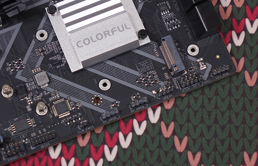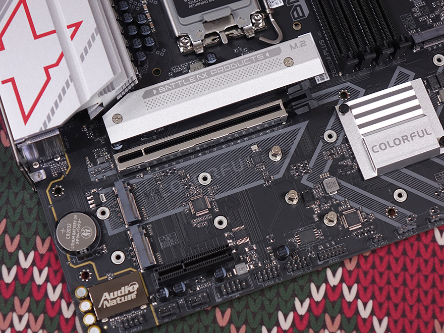 PCI 슬롯은 2개를 구성하고 있으며, 그래픽카드 장착되는 1번 PCI 슬롯은 PCIe 5.0x16 지원을 하며, 나머지 하나의 슬롯은 PCIe 4.0x4 규격을 지원합니다. 그리고, 1번 PCI 슬롯 바로 위에는 M.2 SSD 1번 슬롯이 배치되어 방열판과 함께 장착되어 있으며, 방열판을 분리하면 역시 2242/2260/2280 길이까지 장착할 수 있고, 방열판 안쪽에는 기본 써멀패드도 부착된 것을 확인할 수 있죠. 또한, 1번 PCI 슬롯 바로 아래에는 추가로 M.2 SSD 슬롯이 2개 더 배치되어 있으며, 하나는 2242/2280/22110까지 장착할 수 있으며, 나머지 하나는 2242/2280까지 장착할 수 있습니다. 또한, 바로 옆 Z890 메인칩셋이 위치한 방열판 바로 아래에도 M.2 SSD 슬롯이 배치되어 있으며, 역시 2242/2280 길이까지 장착할 수 있죠. 그래서, Battle-AX Z890M-Plus V20 메인보드에는 총 5개의 M.2 SSD를 장착할 수 있습니다.