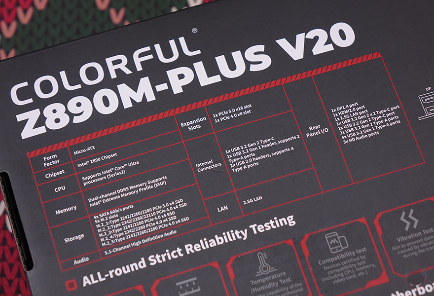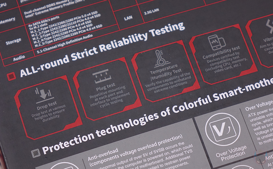 제품 박스부터 살펴보면, 박스에 제품 이미지를 따로 없으며 전면에 모델명을 큼지막하게 표기해놨습니다. 물론, 아래에는 이번 인텔 코어 울트라 시리즈 2(Core Ultra Series 2) CPU 소켓과 지원, Z890 칩셋 표기도 확인할 수 있으며, 추가로 PCIe 5.0 지원, 컬러풀의 통합 소프트웨어 iGame Center 지원표기도 확인할 수 있죠. 박스 후면에는 제품의 기본 사양 표기와 함께 좀 더 다양한 정보를 확인할 수 있는데, 기본 사양 표기 바로 옆에는 추가로 백패널 I/O 포트 표기를 해놨으며, 아래로는 컬러풀에서 진행한 안전 테스트 8가지 표기와 컬러풀에서 항상 강조하는 6가지 보호기술 언급을 담고 있습니다. 안전 테스트에는 낙하(Drop)부터 연결(Plug), 온도(Temperature), 호환(Compatibility), 진동(Vibration), 풀-로드(Full-load), 노화(Aging), 열충격(Thermal shock)을 통과했으며, 6가지 보호기술은 과전압보호/고발열보호/정전기보호/낙뢰보호/습기보호/전력과부하보호를 말합니다.