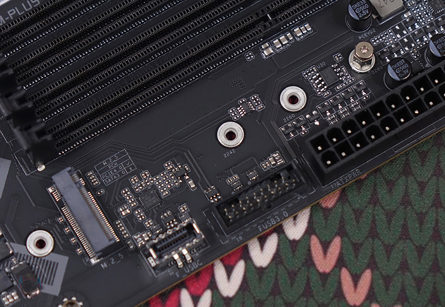메모리 슬롯은 4개 구성으로 총 192GB 용량을 지원하며, 논-바이너리 용량도 단일 48GB까지 지원합니다. 또한, 메모리 오버클럭도 8400MHz까지 지원하며, 슬롯 주변으로는 5V ARGB 헤더와 부팅 상태를 체크하는 디버그(Debug) LED가 적용되어 있으며, M.2 SSD 슬롯도 앞쪽에 1개 장착할 수 있게 배치 적용된 것을 확인할 수 있죠. M.2 SSD 슬롯은 2242/2260/2280 길이까지 장착할 수 있으며, 슬롯 바로 옆에는 추가로 USB 3.2 Gen2 Type-C 헤더와 USB 3.2 Gen1 헤더 배치를 확인할 수 있습니다. 그리고, 같은 위치 맨 아래 그러니깐 메인보드 맨 오른쪽 아래에는 S-ATA 6 Gbps 커넥터 4개가 적용된 것을 확인할 수 있죠.