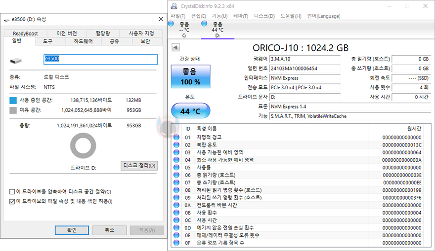 직접, 오리코(ORICO) e3500 NVMe SSD를 사용해 보면, 일단 인식을 위해 운영체제에서 포맷 과정을 거쳐야 합니다. 리뷰에선 1TB 용량 모델을 사용했으며, 포맷과정 후 정상적으로 인식되면 NTFS 포맷 방식 기준 약 953GB의 용량이 남는 것을 확인할 수 있으며, CrstalDiskInfo를 통해 제품 정보를 확인해 보면, PCIe 3.0x4 규격임을 확인할 수 있고, TRIM과 쓰기 속도 저하 방지를 위한 VolatileWriteCache 기술이 적용된 것을 확인할 수 있습니다. 다만, 아직까지 제품명은 J10으로 인식되고 있어서 수정이 필요할 것으로 보입니다.