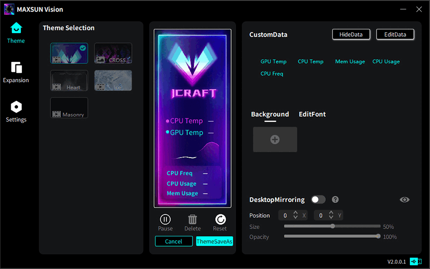 그리고, 앞서 언급했듯이 iCRAFT Z890 ARCTIC 메인보드 방열판부분에 적용된 3.4인치 LCD 디스플레이 역시 사용자가 프로그램을 통해 다양하게 설정할 수 있는데, MAXSUN View(Vision)라는 프로그램을 홈페이지에서 다운로드하여 설치하면, 메뉴는 크게 Theme, Expansion, Settings으로 구분된 걸 확인할 수 있습니다. Theme는 PC를 사용하는 동안에 LCD 디스플레이 시스템 모니터링 정보를 보여주는 기능이며, Theme에선 모니터링할 수 있는 정보를 사용자가 선택할 수 있고, 배경과 폰트도 수정할 수 있습니다. 그리고, Expansion은 부팅(Boot), 시스템종료(Shut), Idle 상태일 때 보여줄 수 있는 이미지나 영상을 설정할 수 있습니다. 참고로, 이미지는 JEPG, 영상은 MP4 파일을 지원하며, 크기는 416x960을 지원합니다. 만약, 프로그램까지 정상적으로 설치했지만, 제어판-장치관리자에서 '알 수 없는 USB 장치(장치 설명자 요청 실패)'로 인식이 되지 않는다면, CPU와 메모리는 메인보드에서 분리했다가 다시 장착하면 정상 인식됩니다.