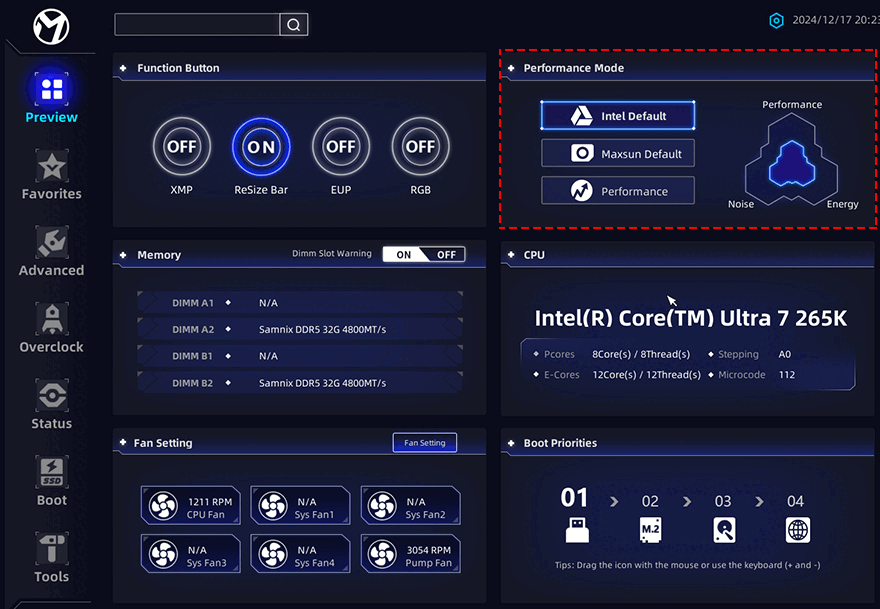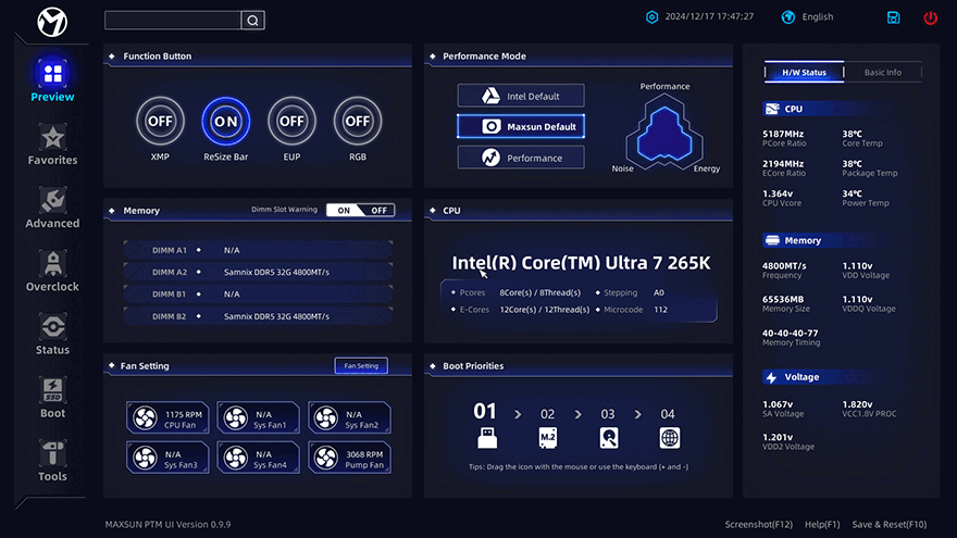 일단, iCRAFT Z890 ARCTIC 메인보드로 시스템 조립을 해서, 전원을 켜면, 외형에서 살펴봤던 백패널 방향쪽 방열판(Heatsink)에 적용된 3.4인치 LCD 디스플레이 화면이 켜지는 걸 확인할 수 있습니다. 물론, 뒤에서 다시 확인하겠지만, 전용 프로그램이 제공되기 때문에 디스플레이에는 더 다양한 화면과 정보를 담을 수 있습니다. 그리고, 하드웨어 지원 성능을 확인해 보기 전 바이오스 CMOS를 들어가 보면, 새로운 디자인 그러니깐 새로운 인터페이스의 CMOS 화면을 확인할 수 있습니다. MAXSUN 제조사에 따르면, 새로운 CMOS 화면의 바이오스를 PTM UI 바이오스(Bios)라고 명칭하고 있으며, 이는 모바일 앱(Mobile App)에서 영감을 얻었다고 합니다. 실제로 살펴보면, 기존에 흔히 보던 CMOS 화면과는 다르게 심플하고 깔끔하게 한 화면에서 모든 걸 다룰 수 있습니다. 흔히 EZ Mode와 Advanced Mode 화면전환을 갖춘 CMOS 화면이 일반적인데, MAXSUN은 이런 화면 전환 역시 각 메인메뉴별로 모든 설정을 다룰 수 있습니다. 일단, 메인메뉴는 맨 왼쪽에 위치하고 있는데, Preview, Favorites, Advanced, Overclock, Status, Boot, Tools 총 7개입니다. Preview 메뉴에선 부가 기능과 성능 모드, 메모리, 팬 설정 등을 바로 다룰 수 있으며, Advanced 메뉴는 다른 메인보드에서 흔히 보는 전체적인 고급설정 메뉴로 CPU, 칩셋(Chipset), PCIE, 저장장치(Storage), USB, 네트워크, TPM, 보안 설정을 다룰 수 있습니다. 그리고, 상태(Status) 메뉴에선 CPU, 메모리, 메인보드 전안 및 온도, 팬 설정 등을 한눈에 모니터링할 수 있죠. 조금 아쉬운 점이라면, 아직 한국어 지원은 없습니다.