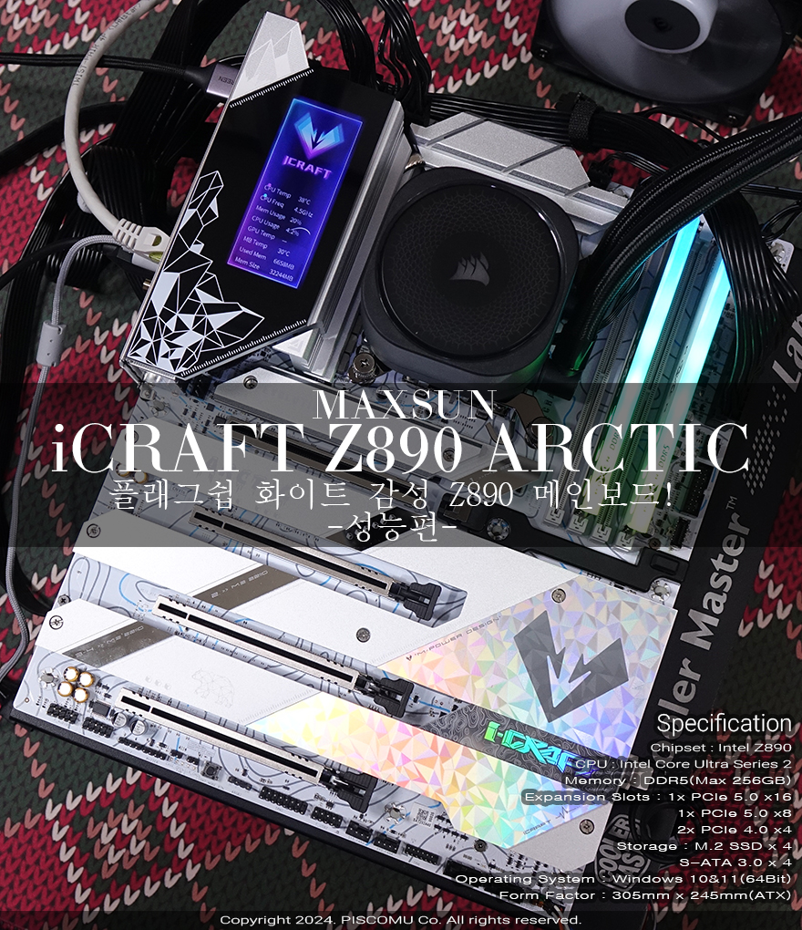 인텔(Intel)이 차세대 데스크탑 CPU 코어 울트라 시리즈 2 '애로우 레이크(Arrow Lake)'를 출시하면서, 이를 지원하는 차세대 칩셋 Z890도 함께 나오면서 메인보드 제조사들은 각각 자신들만의 차별화로 Z890 메인보드(Motherboard) 제품들을 선보이고 있습니다. MAXSUN(맥선) 역시 이번 인텔 차세대 CPU와 함께 많은 변화를 주면서 Z890 메인보드 제품들을 선보였는데, 그중 유일하게 플래그쉽 화이트 콘셉트로 출시한 iCRAFT Z890 ARCTIC 메인보드를 지난 시간에 외형편(https://piscomu.com/314894)으로 만나봤습니다. 이번 시간에는 지난 시간에 이어 두 번째 시간으로 바로 iCRAFT Z890 ARCTIC 메인보드의 기능과 하드웨어 성능 지원, 그리고 부가 기능들을 살펴볼 텐데, 과연 어떤 차별화 기능들을 지원하고 있는지 확인해 보도록 하죠.
