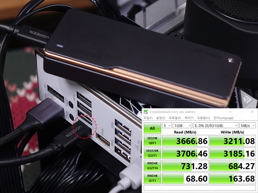 이번에는 저장장치(Storage) 지원에 대해서 확인해보는데, 지난 시간 iCRAFT Z890 ARCTIC 외형 편에서 이미 확인했듯이 총 4개의 M.2 SSD 슬롯을 갖추고 있습니다. 1번 M.2 SSD 슬롯은 PCIe 5.0x4 규격까지 지원하며, 나머지 3개의 M.2 SSD 슬롯은 PCIe 4.0x4 규격까지 지원하는데, PCIe 5.0x4 NVMe SSD는 아직 가격이 높은 만큼 대중적으로 많이 사용하고 있는 PCIe 4.0x4 NVMe SSD로 각 슬롯의 읽기와 쓰기 속도를 확인해 보면, PCIe 4.0x4 규격의 최대 속도인 읽기 7000MB/s대와 쓰기 6500MB/s대 수치를 모든 슬롯에서 보여줍니다. 또한, 백패널 I/O 포트에는 USB 4.0 포트를 2개 갖추고 있죠. 이 부분 역시 USB 4.0 외장 SSD를 사용해 속도확인을 해보면, USB 3.2 Gen2x2 SSD보다 따른 3000MB/s 대의 속도를 보여줍니다.