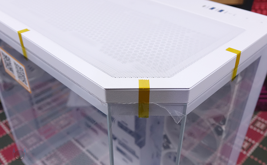 전면부터 좀 더 자세히 살펴보면, 전면 강화유리 패널은 볼-헤드핀 클램프 방식으로 윗부분에 적용되었고, 분리해서 패널 안쪽을 보면 프레임과 함께 아랫쪽에는 걸쇠가 적용되어 있습니다. 대각선 방향의 강화유리 패널 역시 윗부분에 볼-헤드핀 클램프 방식에 아래쪽에 걸쇠가 적용되었으며, 위아래로 파손방지를 위한 프레임 적용되어 있습니다.