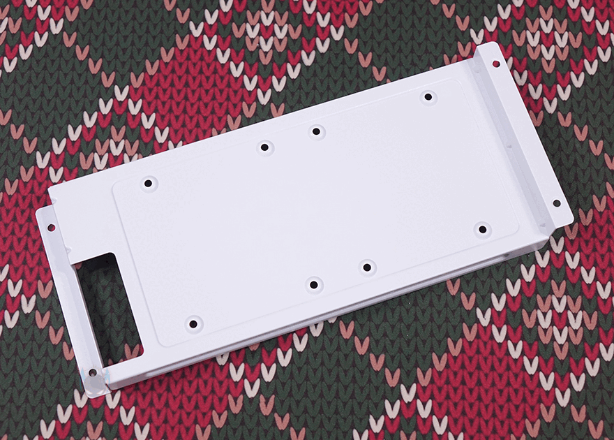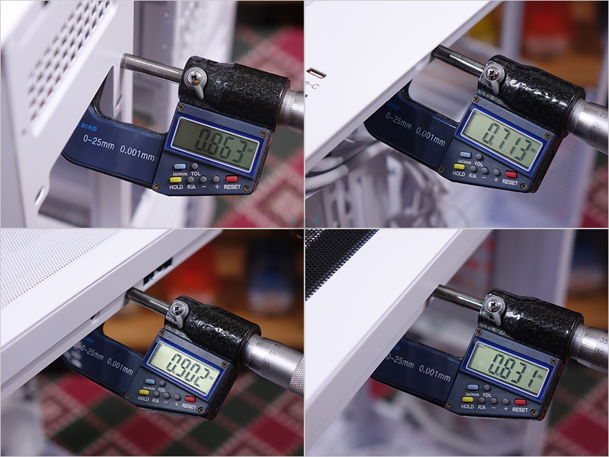 내부 후면 그러니깐 메인보드 트레이 후면 공간을 살펴보면, 일단 아랫공간에는 저장장치를 장착할 수 있는 브래킷이 장착되어 있습니다. 양쪽으로 고정하고 있는 나사들을 풀면 쉽게 분리가 되고, 브래킷에는 2.5인치 SSD/HDD를 최대 2개 장착할 수 있고, 반대편 그러니깐 안쪽으로는 3.5인치 HDD를 1개 장착할 수 있습니다. 그리고, 브래킷 자리 위 즉, CPU-cut-Out 뒷면에는 파워서플라이 자리로 받침대 디자인을 하고 있으며, 전체 후면 공간은 약 90mm로 충분히 케이블을 정리하기에 넉넉한 공간을 확보하고 있습니다. 끝으로, DQX80에 사용된 새시의 두께는 부위별로 측정해 보면 0.7~0.9mm대인 것을 확인할 수 있으며, 강화유리 패널이 장착되는 프레임 쪽에 좀 더 두꺼운 새시를 사용했습니다.