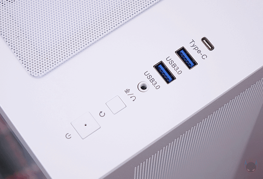 케이스 상단 같은경우에는 자석 방식의 먼지 필터가 부착되어 있으며, 분리하면 상단 쿨링시스템을 갖출 수 있게 나사홀과 함께 벌집 모양 에어홀을 적용했습니다. 참고로 상단 쿨링시스템은 팬을 사용했을 시 120mm 최대 3개를 장착할 수 있고, 수랭쿨러 사용 시에는 최대 360mm 라디에이터를 장착할 수 있죠. 그리고, 상단 앞부분 오른쪽에는 버튼과 포트가 배치되어 있으며, 전원 버튼, 리셋버튼, 오디오 포트, USB 3.0 포트 2개, USB 타입 C 포트 1개 순으로 적용되어 있습니다. 참고로, 출시기념 이벤트로 구매자에겐 팬 컨트롤 허브를 제공해주고 있으며, 허브를 리셋버튼 케이블과 연결하면 메인보드 RGB Sync가 없는 시스템에서도 다양한 RGB 모드로 사용할 수 있습니다.