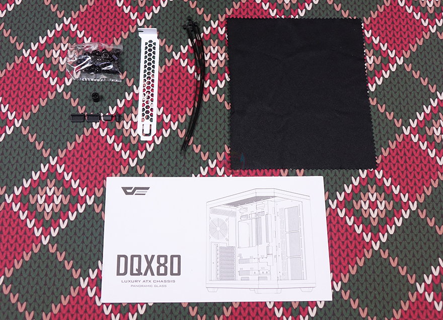 케이스 포장은 기본 비닐포장과 함께 외부 충격방지를 위해 스티로폼 포장재를 사용했으며, 케이스를 제외한 나머지 부속품 제공에는 부품 장착에 사용되는 나사들, Stand-off 렌치, 포트 마개, PCI 슬롯가이드 1개, 소량의 케이블타이, 클린-천 그리고 제품설명서로 이루어져 있습니다. 제품 설명서는 그림형식으로 부품 지원 표기를 간략하게 해놨으며, 개봉 시에는 DQX80에 적용된 강화유리 흔들림 방지를 위해 테이프로 고정해 놨으며, 강화유리에 부착된 보호비닐과 함께 제거하면 됩니다.