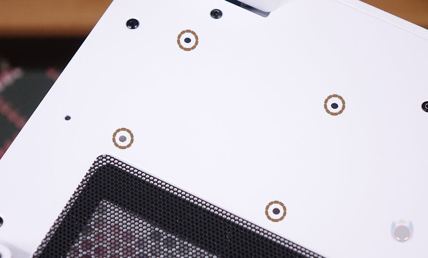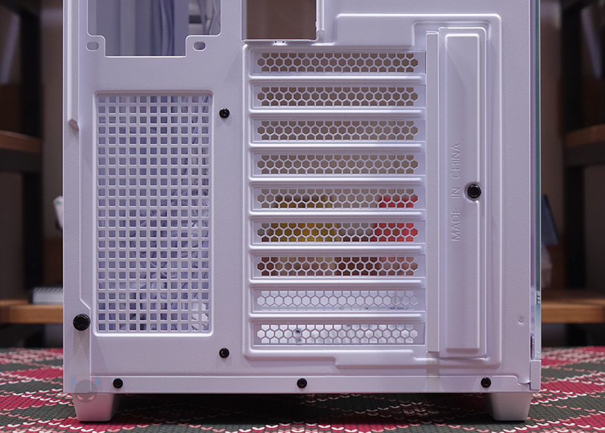 사이드 패널 역시 왼쪽 패널은 대각선 패널에서 그대로 이어지는 디자인이기때문에 동일하게 무나사 방식의 볼-헤드핀 클램프 방식으로 고정하면, 아래에 걸쇠가 적용되어 있죠. 그래서, 전면부터 왼쪽 측면 패널까지 3면이 모두 동일한 구조입니다. 참고로 대각선 패널은 전면이나 측면 패널은 분리한 상태에서 분리하는 게 편합니다. 그리고, 반대편에 오른쪽 패널은 후면 손나사를 사용한 고정 방식이며, 내부 구조상 측면 쿨링시스템을 갖출 수 있고, 저장장치와 파워서플라이가 위치하기 때문에 위치에 맞춰서 메쉬 디자인을 패널 양쪽에 적용했습니다. 구멍이 촘촘하기 때문에 별도의 필터는 적용되어 있지 않죠.