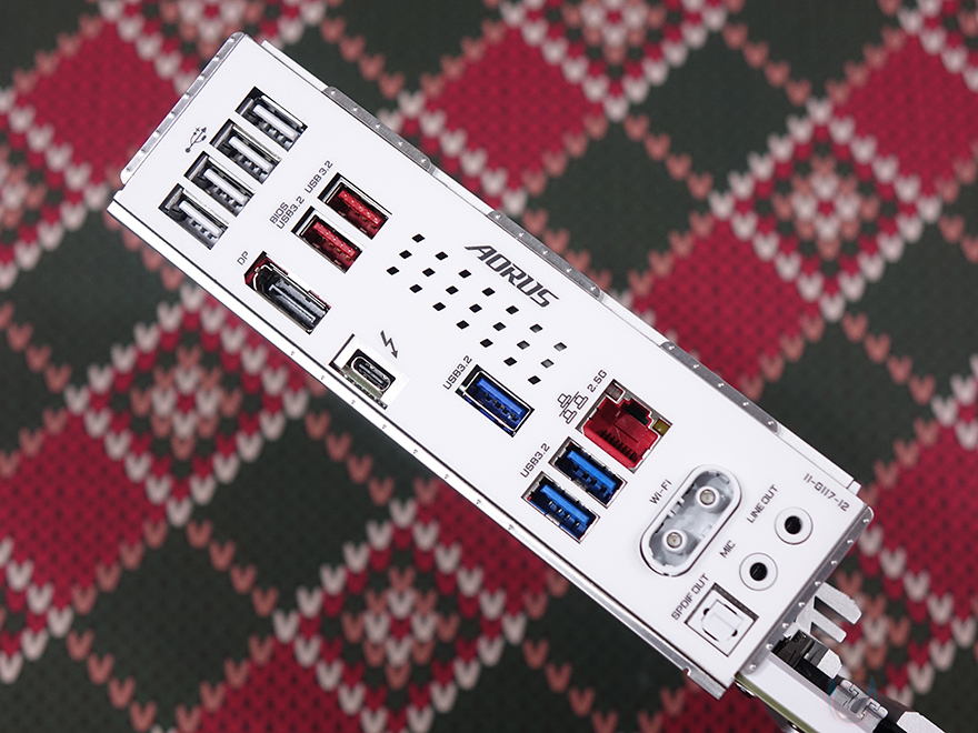 추가 M.2 SSD 슬롯들 아래에는 역시 추가 PCIe 슬롯이 2개 더 배치되어 있으며, 모두 PCIe 4.0x4 규격을 지원하고, 슬롯과 같은 위치에 맨 아래에는 추가 5V ARGB 헤더 2개와 12V RGB 헤더, USB 내부 헤더 등이 배치되어 있는데, 모두 화이트 색상으로 적용되었습니다. 그리고, 메인보드 맨 오른쪽 아래에는 PC케이스 버튼들과 연결되는 패널 커넥터와 추가 팬 커넥터를 확인할 수 있는데, 역시 화이트 색상으로 적용되었으며, 메인보드 맨 왼쪽은 내장 오디오 적용으로 독립 PCB 구간처리와 함께 Realtek사 칩셋이 적용된 것 확인할 수 있죠. 끝으로, 백패널 I/O부분을 살펴보면, 일체형 패널과 함께 역시 패널 색상도 화이트로 적용되었으며, 포트 구성에는 맨 위에서부터 USB 2.0/1.1 포트 4개, USB 3.2 Gen2 타입 A(레드) 포트 2개, DP, USB 타입 C 포트, USB 3.2 Gen1 포트 3개, 2.5G 랜포트, Wi-Fi 안테나 커넥터, 오디오 포트 2개, 광 S/PDIF 출력포트순으로 배치되어 있습니다. 참고로, USB 타입C 포트는 USB 4.0 규격으로 썬더볼트 4와 모니터 출력포트 겸용으로 사용할 수 있으며, 썬더볼트 모니터에 연결했을 시에는 최대 5120x2880@60Hz 해상도, USB4 모니터 연결 시에는 최대 3840x2160@240Hz 해상도까지 지원합니다.