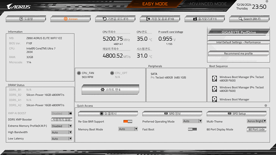직접, 기가바이트 Z890 AORUS ELITE WIFI7 ICE 메인보드를 사용해 보면, 일단 시스템 구성을 갖추고 전원을 켜면 앞서 언급한 전원부 방열판의 AORUS 로고 부분에 RGB 라이트닝 효과를 볼 수 있으며, 추가로 SATA 커넥터 주변 그러니깐 Z890 메인칩셋이 적용된 방열판 아랫부분에도 LED를 통한 RGB 라이트닝 효과를 볼 수 있습니다. 물론, 기가바이트에서 제공하는 RGB Fusion II 프로그램을 설치하면 다양한 모드 전환과 다른 주변 장치와의 RGB Sync로도 함께 작동시킬 수 있죠. 그리고, 각 하드웨어 지원별 성능을 알아보기 전에 바이오스 CMOS를 진입해 보면, 이전 화이트 제품들과 마찬가지로 Z890 AORUS ELITE WIFI7 ICE 메인보드 역시 화이트를 배경으로 인터페이스를 적용하고 있으며, F2키를 통해 EASY Mode와 Advanced Mode로 전환할 수 있고, Advanced Mode에서 메뉴는 기존 제품들과 마찬가지로 즐겨찾기/Tweaker/Setting/System Info/Boot/Save&Exit로 구성되어 있습니다. 물론, Z890칩셋 기반이기 때문에 Tweaker에서 CPU와 메모리 오버클럭 설정도 가능하죠.