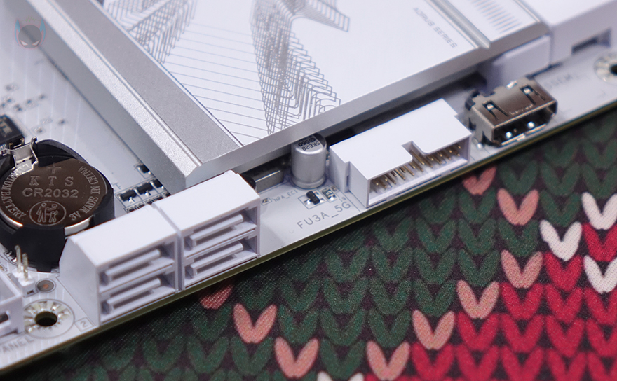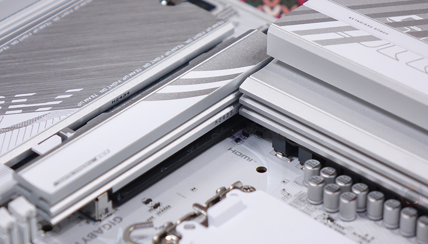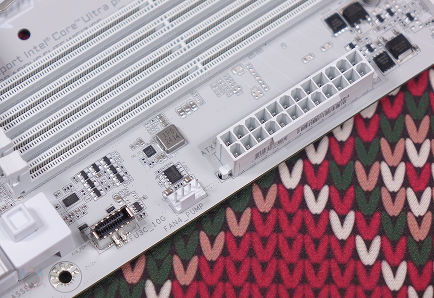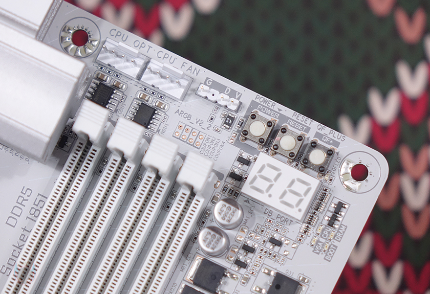 메모리 슬롯은 총 4개 구성으로 이전 기가바이트 화이트 메인보드 제품에선 이 메모리 슬롯 부분이 검은색이라 일부 소비자들이 유일하게 화이트 콘셉트에서 아쉽다는 지적이 많았죠. 하지만, 이번 화이트 메인보드 제품부터는 이런 의견을 반영해 메모리 슬롯까지 모두 화이트색상으로 적용했습니다. 메모리는 DDR5를 지원하고, 총 최대 256GB 용량에 9200 MHz 클럭까지 호환리스트상 지원하고 있습니다. 또한, 메모리 슬롯 주변으로는 추가 팬 커넥터와 5V ARGB 헤더, 전원/리셋/Q-Flash 온보드 스위치와 디버그 LED가 배치되어 있는데, 모두 화이트 색상으로 적용했으며, 슬롯 앞자리에 24핀 전원 커넥터와 팬 커넥터까지도 화이트 색상이죠. 참고로 24핀 전원 커넥터와 같은 라인선상으로 왼쪽으로는 USB 3.2 Gen2 타입 C 헤더, HDMI, USB 3.2 Gen1 내부 헤더, SATA 6 Gbps 커넥터 4개가 배치되어 있는데, HDMI를 제외하고 모두 화이트 색상으로 적용되어 있습니다.