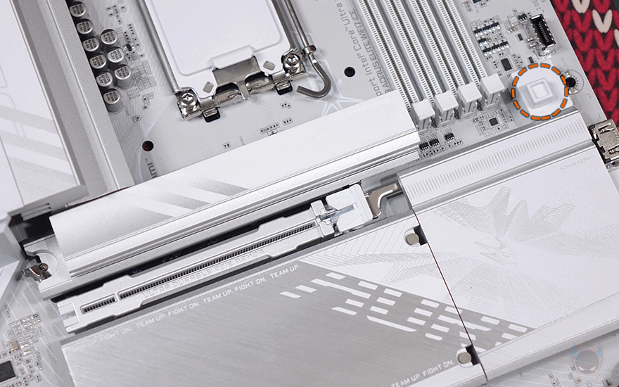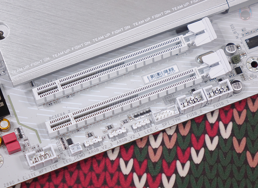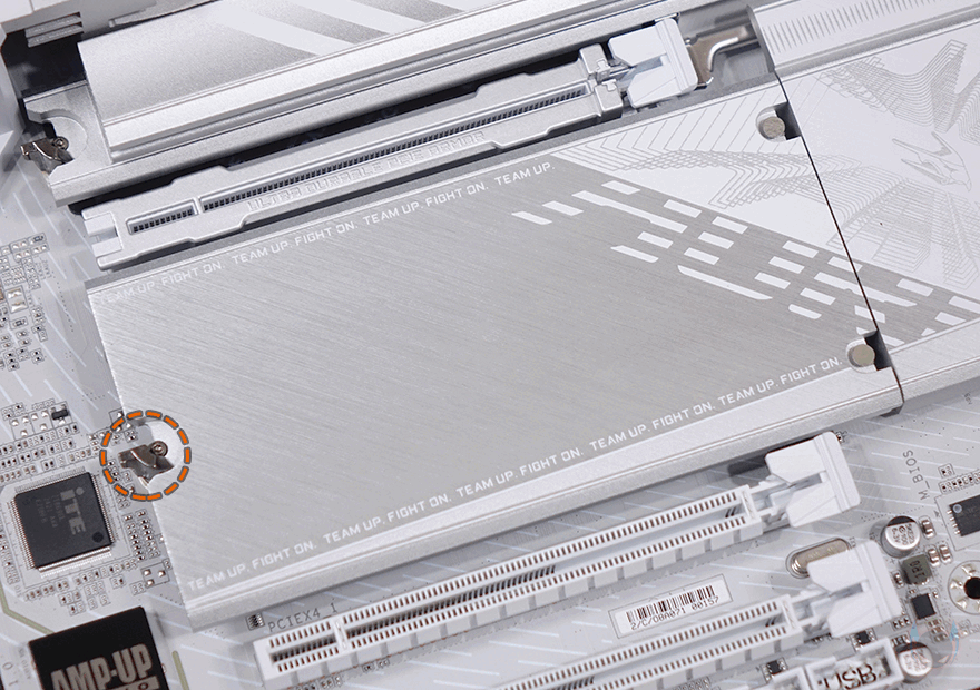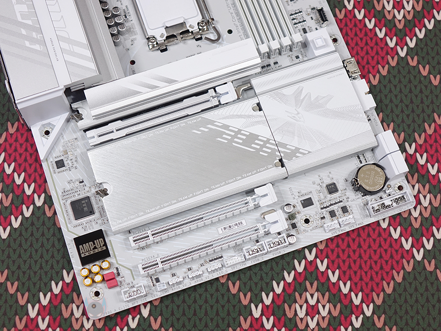 PCI 슬롯 부분은 먼저 그래픽카드가 장착되는 1번 슬롯 위에 M.2 SSD 슬롯 1번이 배치되어 있는데, 무나사 방식의 EZ-Latch Click을 적용해 방열판을 손쉽게 분리/장착할 수 있습니다. 또한, M.2 SSD 장착도 EZ-Latch Plus 기술을 적용해 무나사 방식으로 손쉽게 장착/분리할 수 있으며, 규격은 PCIe 5.0x4까지 지원하고, 25110/22110/2580/2280 사이즈까지 장착할 수 있죠. 물론, 방열판 안쪽과 슬롯 아랫부분 모두 써멀패드도 기본 부착되어 있으며, 방열판 높이도 전원부 방열판과 같은 높이로 두꺼워 높은 쿨링효과를 기대할 수 있습니다. M.2 SSD 1번 슬롯 바로 아래에 위치한 PCIe 1번 그래픽카드 슬롯은 PCIe 5.0 규격으로 내구성이 10배 강화된 UD Slot X 기술을 적용했으며, 메모리 슬롯 앞부분에 위치한 EZ-Latch Plus 버튼을 통해 손쉽게 그래픽카드를 탈거할 수 있게 해 줍니다. PCIe 1번 슬롯 아래에는 추가 M.2 SSD 슬롯이 배치되어 있는데, 역시 방열판이 기본 장착되어 있으며, EZ-Latch Click의 무나사 방식으로 손쉽게 분리/장착할 수 있으며, 총 3개의 슬롯이 배치되어 있습니다. 슬롯은 모두 PCIe 4.0x4 규격까지 지원하며, SSD 장착도 모두 EZ-Latch Plus 무나사 방식입니다. 장착 사이즈는 가운데만 1번 M.2 SSD 슬롯과 동일하게 25110/22110/2580/2280 길이까지 지원하며, 위아래 나머지 2개의 슬롯은 22110/2280 길이만 장착할 수 있죠.