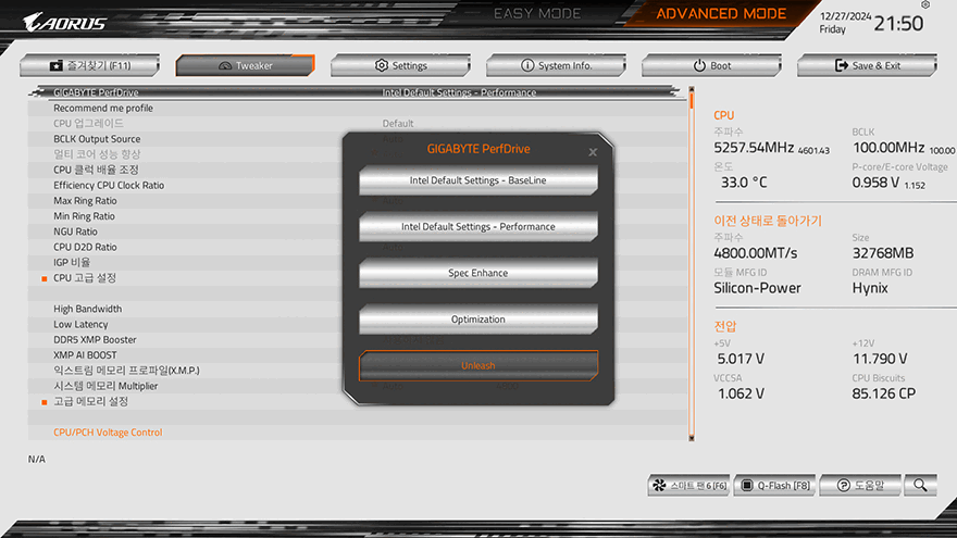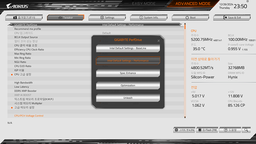 먼저, CPU 성능을 확인해 보면 Z890 AORUS ELITE WIFI7 ICE 메인보드는 앞서 확인했듯이 인텔 차세대 데스크탑 CPU 코어 울트라 시리즈 2를 지원합니다. 그래서, 코어 울트라 7 265K CPU를 장착하고, 최신 바이오스까지 업데이트하면, CMOS에서 인텔 가이드라인에 맞춘 프로파일 설정값으로 기본 작동하는데, Cinebench R23으로 실행해 보면 멀티코어 35000점대로 기본설정값에서 최대한 발휘하는걸 확인할 수 있습니다. 물론, 방금 언급했듯이 Z890칩셋기반이기때문에 CPU 오버클럭도 지원하는데, 일단 오버클럭을 위해서는 CMOS에 GIGABYTE PerfDrive에서 인텔 기본설정값말고 Unleash를 선택하면 전력해제와 함께 배수설정을 할 수 있습니다. 다만, Unleash 선택과 함께 경고문구도 확인할 수 있는데, 오버클럭로 인한 문제 발생은 사용자의 책임이라는거죠. 일단, 코어 울트라 시리즈 2 CPU 같은경우에는 이전세대에서 많이 지적되던 전력문제에 해결을 위해 전력관리에 초점을 맞췄기때문에 사실상 오버클럭 수율은 높지않습니다. 물론, CPU 수율이 가장 중요하지만, CPU만 오버클럭해서는 큰 성능향상을 기대하는 어렵죠. 실제 Unleash 선택 후 수동 오버클럭을 시도해 Cinebench R23을 실행해보면 큰 점수차이를 보이지 않습니다.