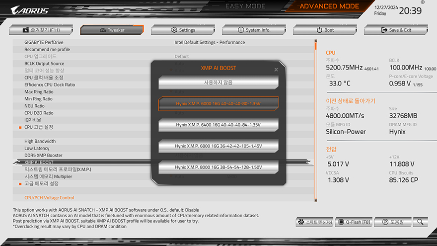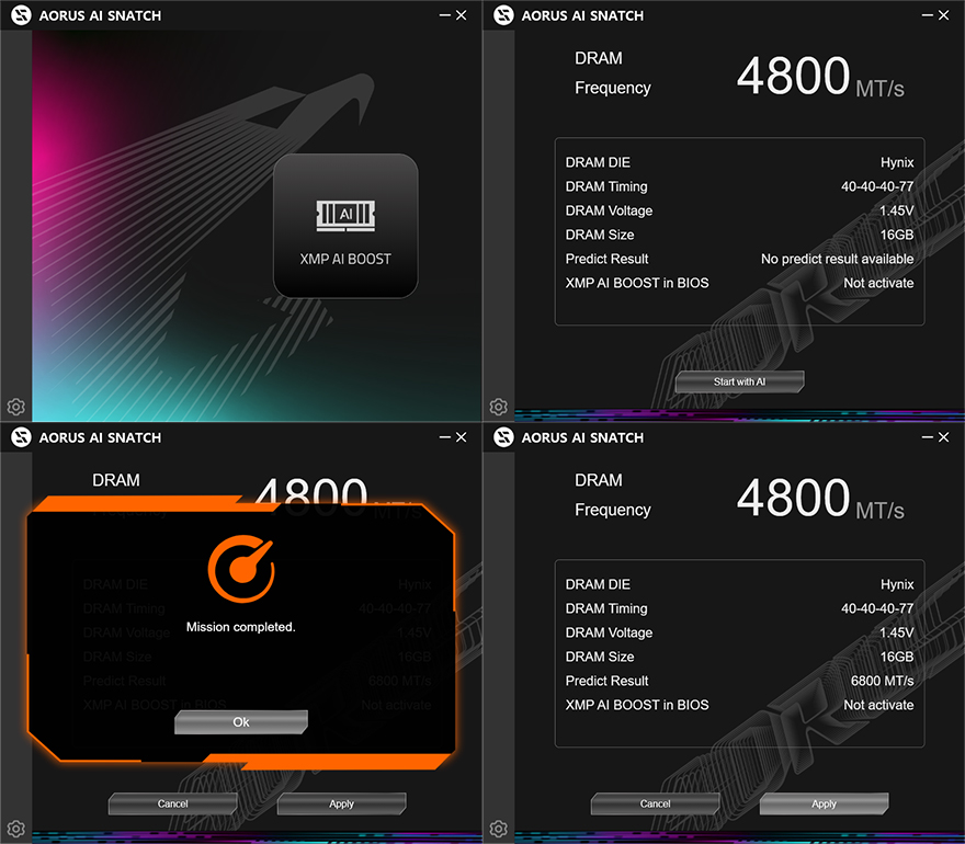 이외에도 기가바이트에서는 AI 기술을 적용한 XMP 수동값을 찾아주는 AI SNATCH라는 프로그램도 제공을 해주는데, 운영체제상에서 해당 프로그램을 실행해서 XMP AI BOOST를 실행하면 자동으로 XMP 수동값을 찾아줍니다. 그리고 적용하면 자동으로 재부팅하면서 자동으로 CMOS로 진입해서 XMP AI BOOST 기능이 활성화된 것을 확인해 보면 측정된 리스트 값을 보여주죠. 소비자는 이 값을 선택해서 메모리 오버클럭을 손쉽게 할 수 있는데, 다만 메모리에 따라서는 DDR5 XMP Booster보다 더 떨어지는 값을 보여주는 경우도 있기 때문에 사용자 판단해서 사용할지 말지 선택하면 되겠습니다.