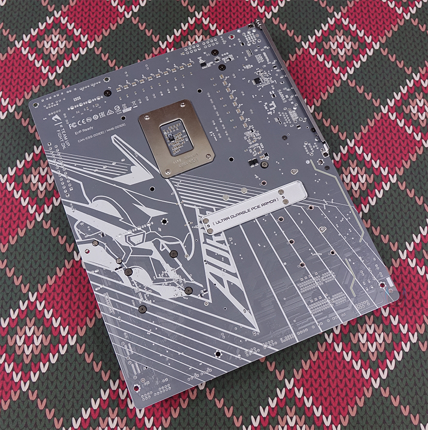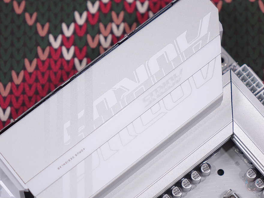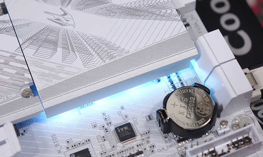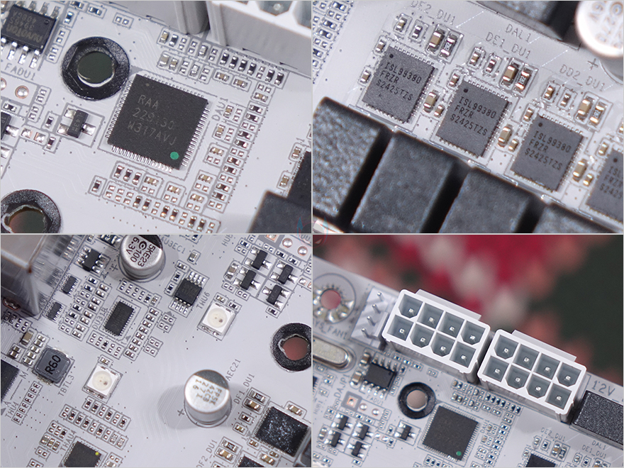 CPU 소켓 주변의 전원부는 모두 방열판이 기본 장착되었으며, 역시 화이트 콘셉트에 맞춰 최대한 밝은 계열의 그레이색상 방열판을 사용했죠. 백패널쪽 방향에 방열판에는 큼지막하게 AORUS 로고를 새겨놨는데, 중간을 가로지르는 작은 AORUS 로고 부분은 바로 뒤에서 확인하겠지만, RGB 라이트닝 효과를 볼 수 있게 했습니다. 방열판을 분리하면 안쪽에 모스펫과 초크에 발열해결을 위해 써멀패드가 기본 부착된 것을 확인할 수 있으며, 두 방열판 사이로 히트파이프도 적용되어 있죠. 전원부는 총 16+1+2 페이즈 구성으로 CPU 전력공급(VCORE)에 16 페이즈와 메모리 전력공급(VCCSA)에 2 페이즈 모스펫은 개당 80A 전력공급의 Renesas사 Dr.MOS를 적용했으며, 컨트롤칩셋 역시 Renesas사 칩셋을 적용했습니다. 이 외에도 주변에는 방금 언급했던 AORUS 로고 부분에 RGB 라이트닝 효과를 위해 2개의 SMD LED가 적용된 것을 확인할 수 있으며, CPU 보조전원 8핀 2개와 바로 옆 팬 커넥터까지 모두 화이트 색상으로 적용된 걸 확인할 수 있죠.