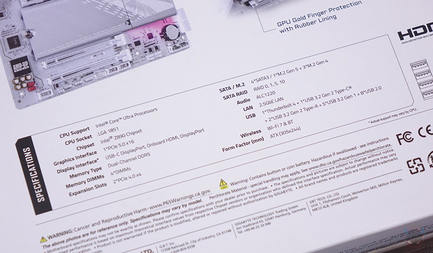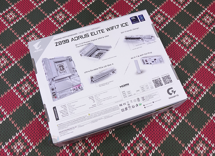 제품 박스부터 살펴보면, 전면 디자인은 기존 어로스 화이트 제품들과 큰 차이가 없습니다. 큼지막한 어로스 로고는 이제 화이트 메인보드에 상징 같은거죠. 그리고, 모델명과 인텔 최신 프로세서 코어 울트라 시리즈 2 CPU 지원과 Z890 칩셋 표기를 확인할 수 있으며, 국내 오랫동안 기가바이트를 정식 수입하고 있는 (주)피씨디렉트의 3년 무상보증 스티커를 확인할 수 있습니다. 제품 이미지는 박스 후면에서 확인할 수 있으며, 주요 특징 4가지를 제품 일부 이미지와 함께 언급하고 있는데, 전원부, 편의성의 EZ-Latch 기술, 내구성이 강화된 PCIe UD Slot X, EZ-Plug 방식의 WiFi 7 지원입니다. 그리고, 아래에는 제품의 기본 사양표기와 백패널 I/O 포트 표기, 홈페이지와 매뉴얼을 전자문서로 접근할 수 있게 QR코드를 표기해 놨죠.