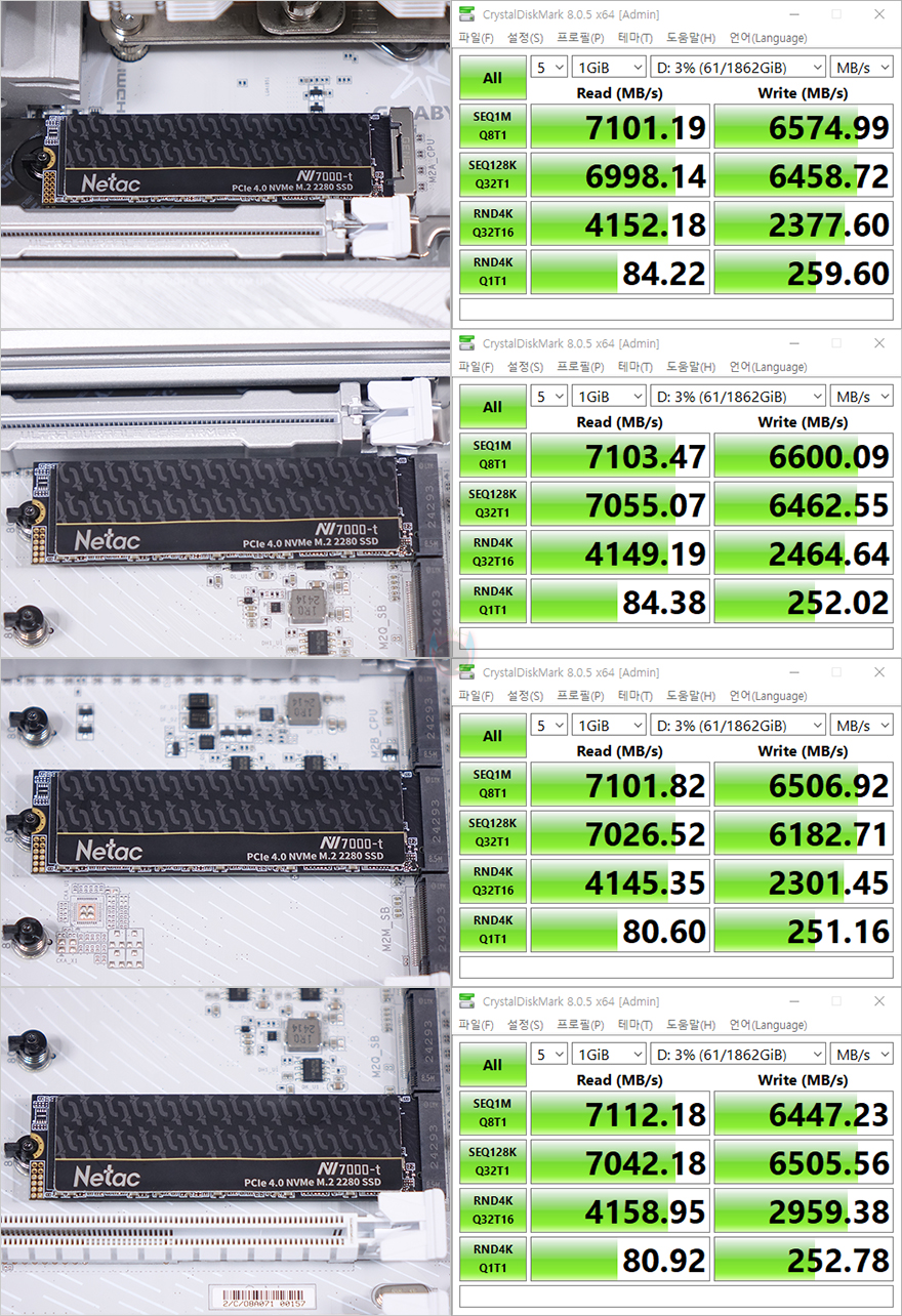 끝으로 저장장치 지원 성능에 대해 확인해 보면, 앞서 확인했듯이 Z890 AORUS ELITE WIFI7 ICE 메인보드에는 총 4개의 M.2 SSD 슬롯을 갖추고 있습니다. 1번 슬롯은 PCIe 5.0x4 규격까지 지원하고, 나머지 4개의 슬롯은 PCIe 4.0x4 규격까지 지원해서 통일된 결과값을 보기 위해 PCIe 4.0x4 규격의 NVMe SSD를 장착해 CrystalDiskMark로 최대 읽기와 최대 쓰기 값을 확인해 봤습니다. 실행 결과, PCIe 4.0x4 규격에서의 평균 최대인 7000MB/s대 읽기와 6000MB/s 쓰기를 4개의 슬롯 모두에서 발휘되는 걸 확인할 수 있습니다.