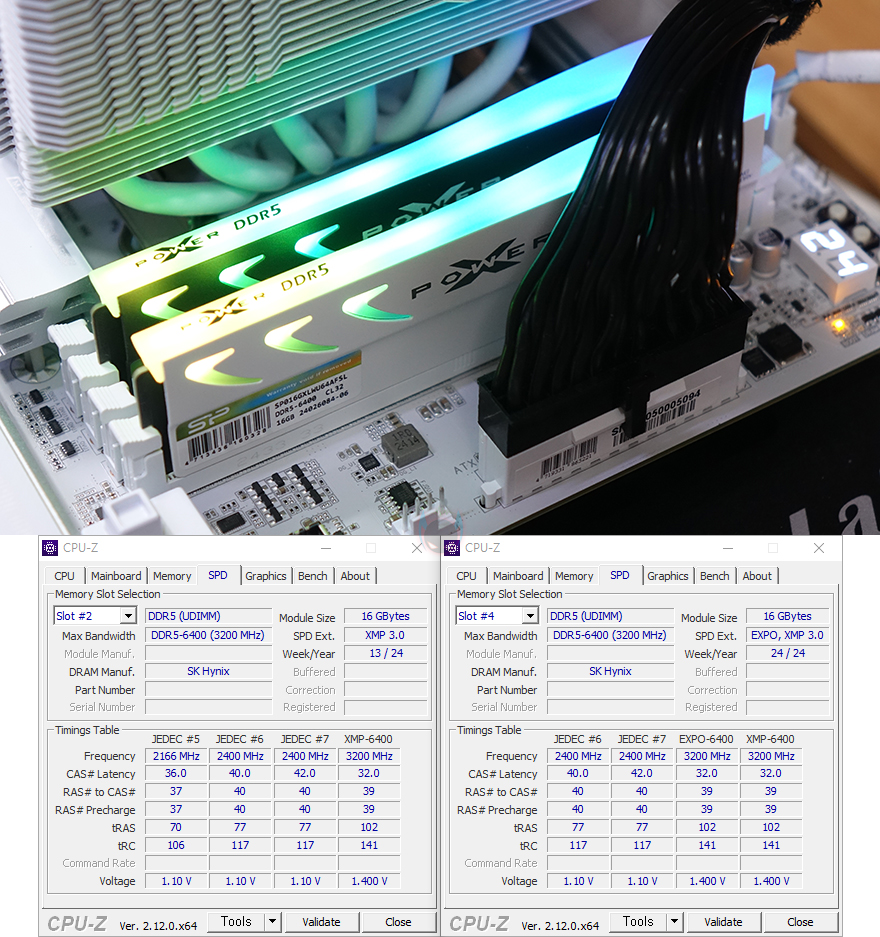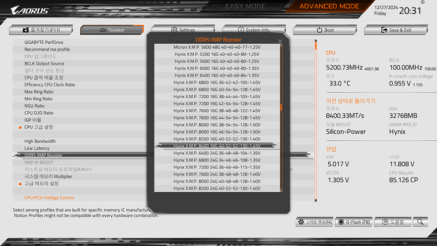 따라서, CPU보다는 메모리 오버클럭이 요즘에는 소비자들에게 더 인기를 받는데, 일단 Z890 AORUS ELITE WIFI7 ICE 메인보드에 XMP 프로파일이 적용된 DDR5 메모리는 장착해, CMOS에서 XMP 프로파일을 불러오면 한 번에 저장된 오버클럭 설정값으로 작동되는 걸 확인할 수 있습니다. 물론, 사용하는 메모리가 하이닉스 A 다이 모듈이면 수동 오버클럭으로 더 높은 오버클럭을 시도해 볼 수도 있는데, 이때 CMOS Advanced Mode에 Tweaker 메뉴에서 DDR5 XMP Booster를 선택하면 기가바이트에서 제공하는 메모리 모듈별 오버클럭 설정값 리스트를 확인할 수 있습니다. 여기서 사용하는 메모리 모듈과 용량을 알고 있다면, 리스트에서 선택한 후, 선택적으로 램 타이밍 값만 조절하면 손쉽게 수동 오버클럭도 할 수 있죠. 실제 리뷰에서도 이방식으로 손쉽게 8400 MHz까지 도달했습니다.