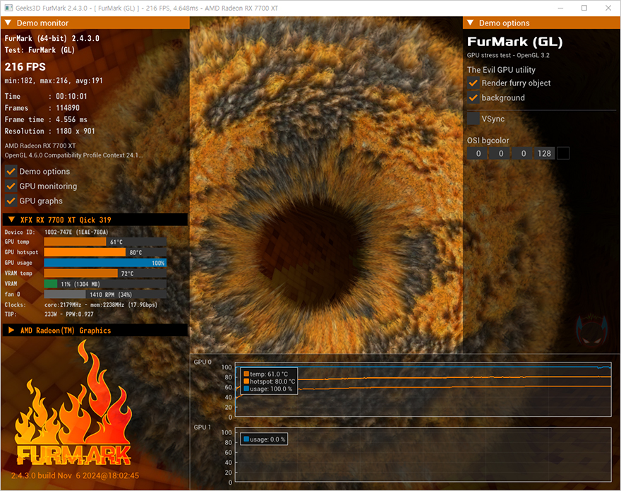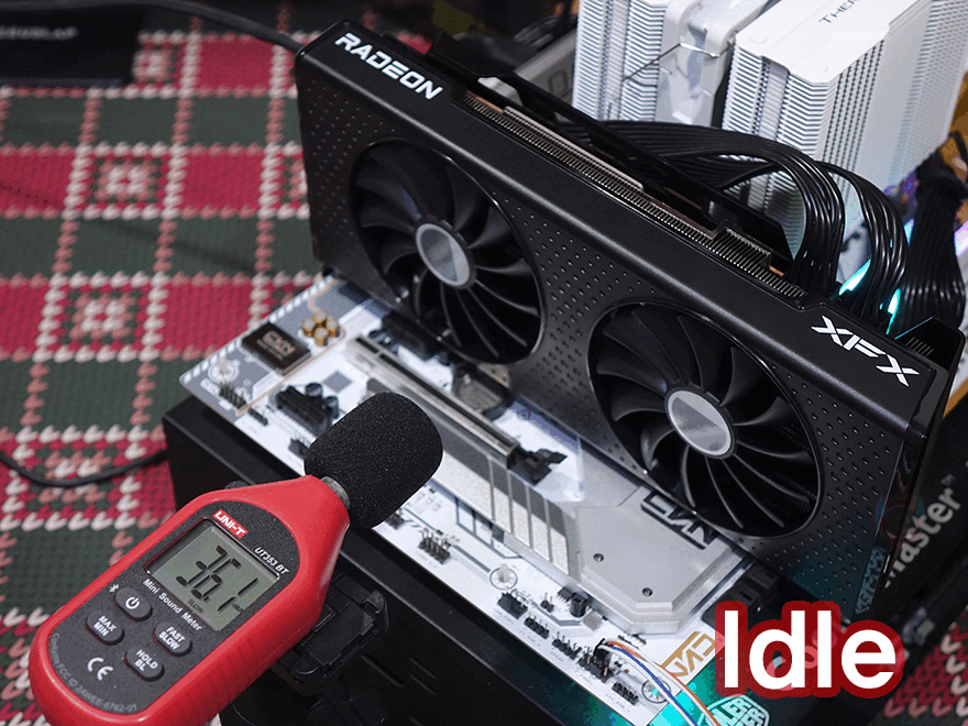 끝으로, XFX 라데온 RX 7700 XT SWFT 210 SCORE 그래픽카드의 쿨링 성능을 확인해 보면, 일단 앞서 언급했듯이 그래픽카드에 장착된 쿨러의 팬은 제로팬 기술을 적용하고 있습니다. 그래서, 일정온도에 도달하기전까지는 작동하지않는 무소음으로 주로 Idle 상황에선 팬이 작동하지 않는다고 보면 됩니다. 그래서, Furmark를 통해 100% 과부하 상태로 팬 작동을 확인해보면 약 10cm 거리에서 측정한 소음값은 약 48dB(A)로 일상생활수준의 소음으로 낮은 편임을 확인할 수 있죠. 또한, 온도 역시 10분간 과부하 상태에서 최대 61℃정도만 보여주고 있어서 소음대비 쿨링성능이 좋은 편임을 확인할 수 있습니다.