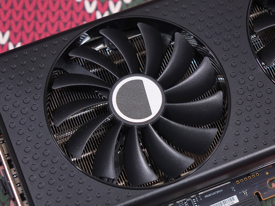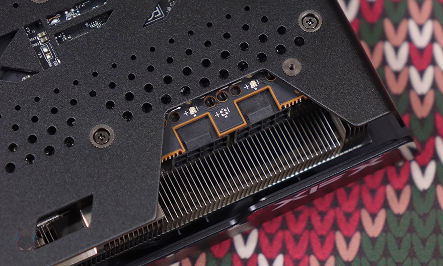 쿨러 측면에는 맨 왼쪽에 라데온 로고를, 맨 오른쪽에는 XFX 로고를 새겨놨으며, 라데온 로고 위치에 PCB 부분에는 듀얼 BIOS 스위치가 배치 적용된 것을 확인할 수 있고, XFX 로고 위치 PCB 부분에는 보조전원 8핀이 2개 적용 배치된 것을 추가로 확인할 수 있습니다. 참고로, 보조전원 커넥터 위쪽에는 연결상태를 확인할 수 있는 LED도 적용되어 있죠. 후면에는 전면 쿨러 색상에 맞춰 블랙색상의 백플레이트가 적용되어 있으며, 한쪽에는 XFX 로고 모양으로 홀 처리가 추가로 적용되어 있습니다.