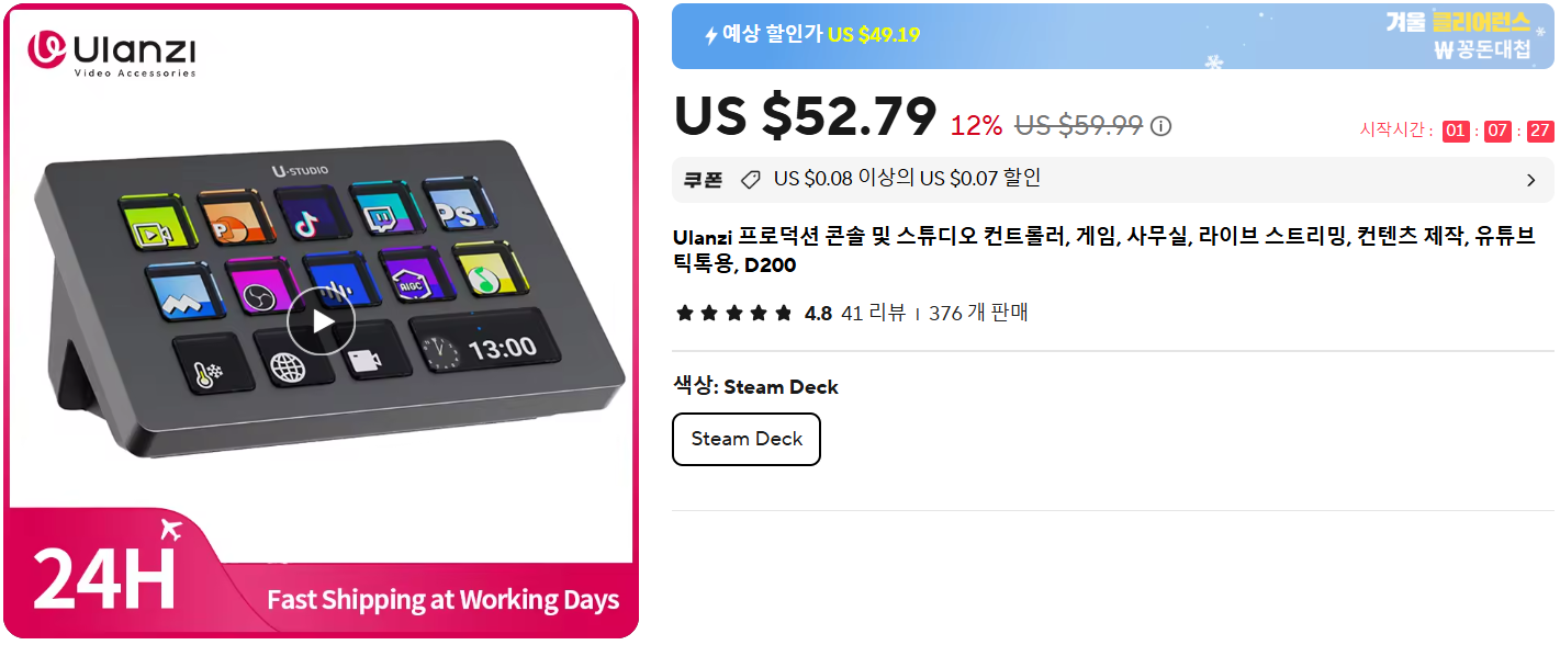 울란지는 그동안 가성비 촬영장비 제품들을 선보이면서도 간간히 데스크 테리어 아이템 제품들도 선을 보였다. 그리고, 가장 최근에는 자사 첫 스팀 덱 제품 D200까지 출시했다. D200은 총 13개의 버튼과 시간표시 디스플레이 조합으로 설정 프로그램을 통해 손쉽게 사용자가 선호하는 프로그램들을 바로 실행할 수 있으니 데스크 테리어용도로 스팀덱을 알아보고 있었다면, 이번 초이스데이에서 놓치지 말자.