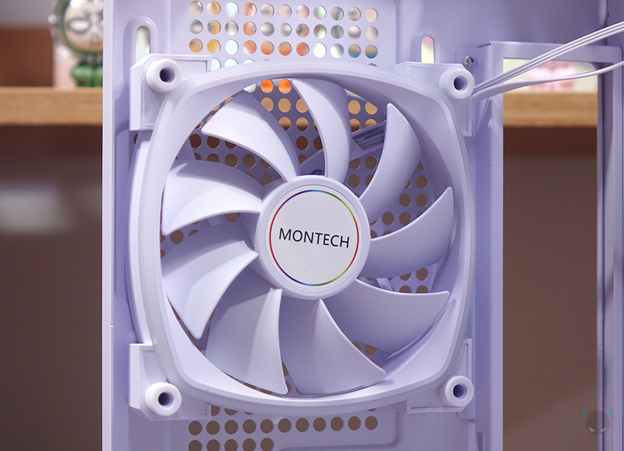 이제 King 65 Pro PC케이스의 내부를 살펴보는데, 내부 구조는 King 95 Pro와 동일하며, 단지 가격부담을 줄이기 위해 약간의 간소화가 적용되었는데, 하나씩 살펴보면서 언급하겠습니다. 일단, 메인보드가 장착되는 트레이 부분에는 CPU-cut-Out을 비롯해 주변으로 선정리홀이 적용되어 있으며, King 95 Pro에선 전체 선정리홀에 일명 고무 패킹인 라우팅 그로밋까지 적용했던 반면에 King 65 Pro에선 측면 선정리홀에만 라우팅 그로밋을 적용했습니다. 그리고, 내부 앞자리 측면에는 동일하게 140mm 리버스 팬 2개를 장착해 기본 측면 쿨링시스템을 갖추고 있으며, 윗부분에 MONTECH 로고 네임플레이트도 그대로 유지하고 있죠. 또한, King 95 Pro에서 소비자에게 선택적 요소를 주었던 측면과 전면 쿨링시스템 변경 역시 King 65 Pro에서도 힌지방식 그대로 유지해주고 있습니다. 팬이 장착된 브래킷을 위아래 고정된 나사를 풀어 그대로 전면으로 배치할 수 있죠. 전면으로 배치했을 때 브래킷 고정방식도 동일합니다. 다만, King 65 Pro에선 전면 배치 시 교체할 수 있는 메쉬 패널이 기본 제공되지 않기 때문에 이 부분은 좀 아쉬우며, 추후 별도로 메쉬 패널이 판매되길 기대해 봅니다. 참고로, 팬 기본 장착의 브래킷도 동일하게 120mm 팬을 장착할 수 있게 나사홀이 적용되어 있고, 수랭쿨러로 장착할 시에는 최대 240mm 라디에이터를 장착할 수 있죠.