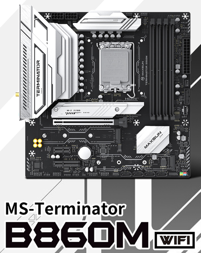 인텔 B860 칩셋기반으로 출시예정인 모델은 Terminator 시리즈에 2종, eSport에 2종, Challenger 시리즈에 1종으로 Terminator 시리즈로 출시한 B860 메인보드는 WIFI 6 기본 적용 유무에 따라 MS-Terminator B860M WIFI와 MS-Terminator B860M 2가지로 출시된다. 이부분을 제외하면 기본적인 전원부 구성은 10+1+1 구성으로 동일하며, DDR5 메모리 지원은 8800MHz 오버클럭까지 가능하며, 3개의 M.2 SSD 슬롯을 갖추고 있으며, 이전 칩셋 모델보다 방열판 디자인이 더 커지고 보조전원도 8핀 2개로 강화되었다.