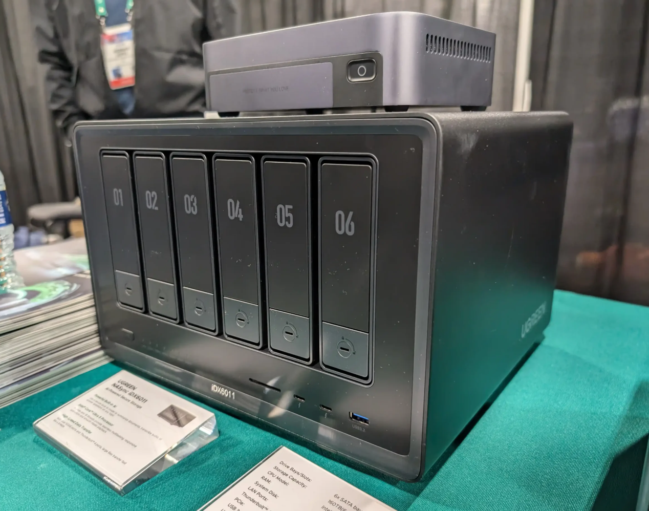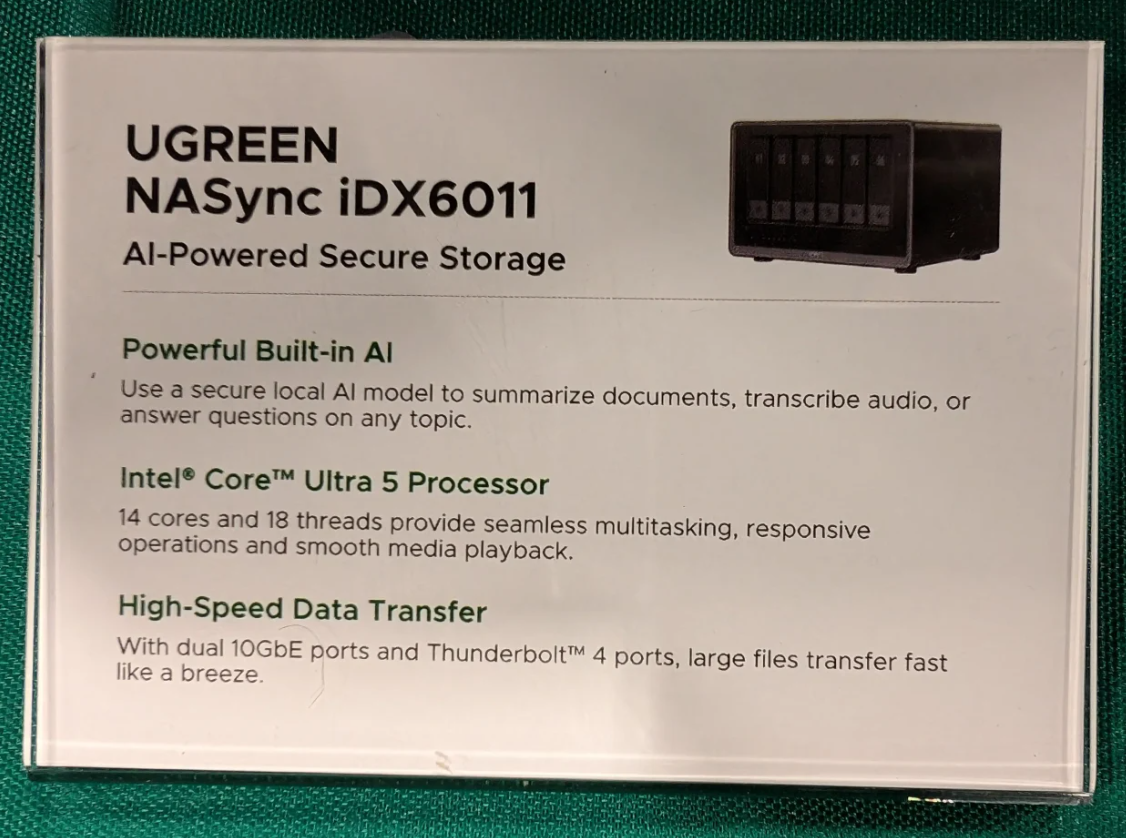 이번 신제품 발표에서 가장 강조한 제품은 바로 NAS 제품으로 최근 NPU 탑재의 CPU 인텔 코어 울트라 시리즈 기반의 NAS인 일명 AI NAS 콘셉트에 iDX 시리즈다. 이는 세계 최초 대규모 언어 모델(Large Language Model, LLM)이 탑재된 NAS이며, AI 채팅을 비롯한 기존 NAS보다 한층 진화된 서비스를 제공할 예정이다. 이번에 공개된 iDX 시리즈 NAS는 iDX6011과 6011 Pro로 CPU는 인텔 코어 울트라 5 125H를 탑재했으며, 6베이 저장장치 지원과 썬더볼트4 지원을 갖추고 있다. 또한, 프로 모델에서는 Oculink 포트를 추가해 더 빠른 전송 효율성을 가지도록 했다.