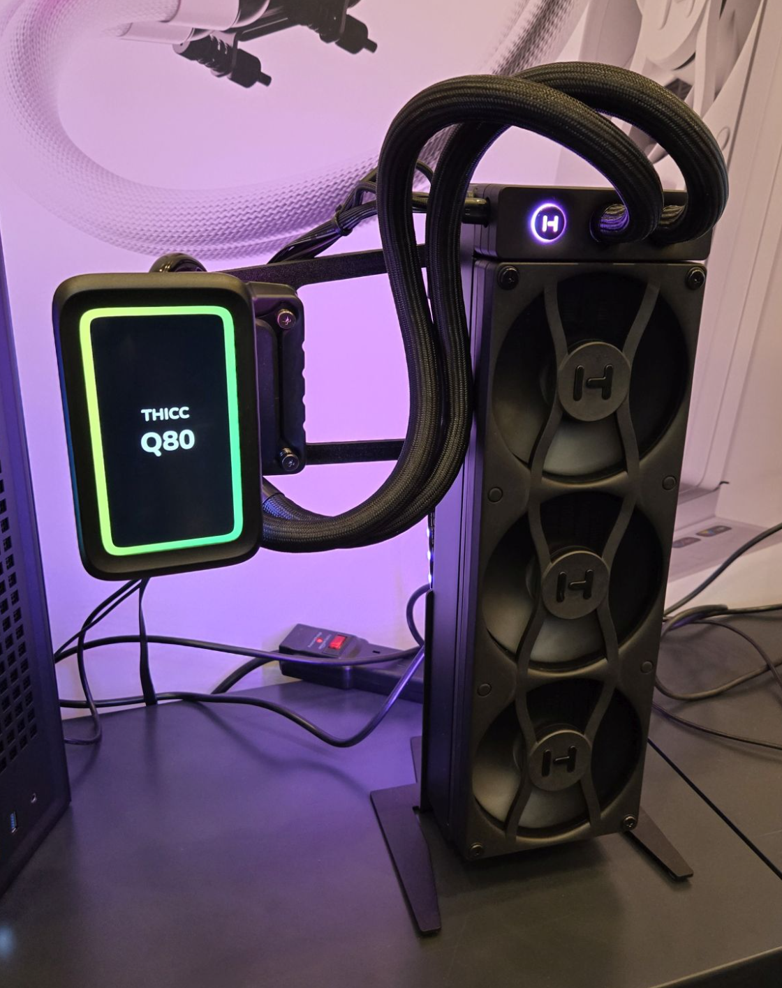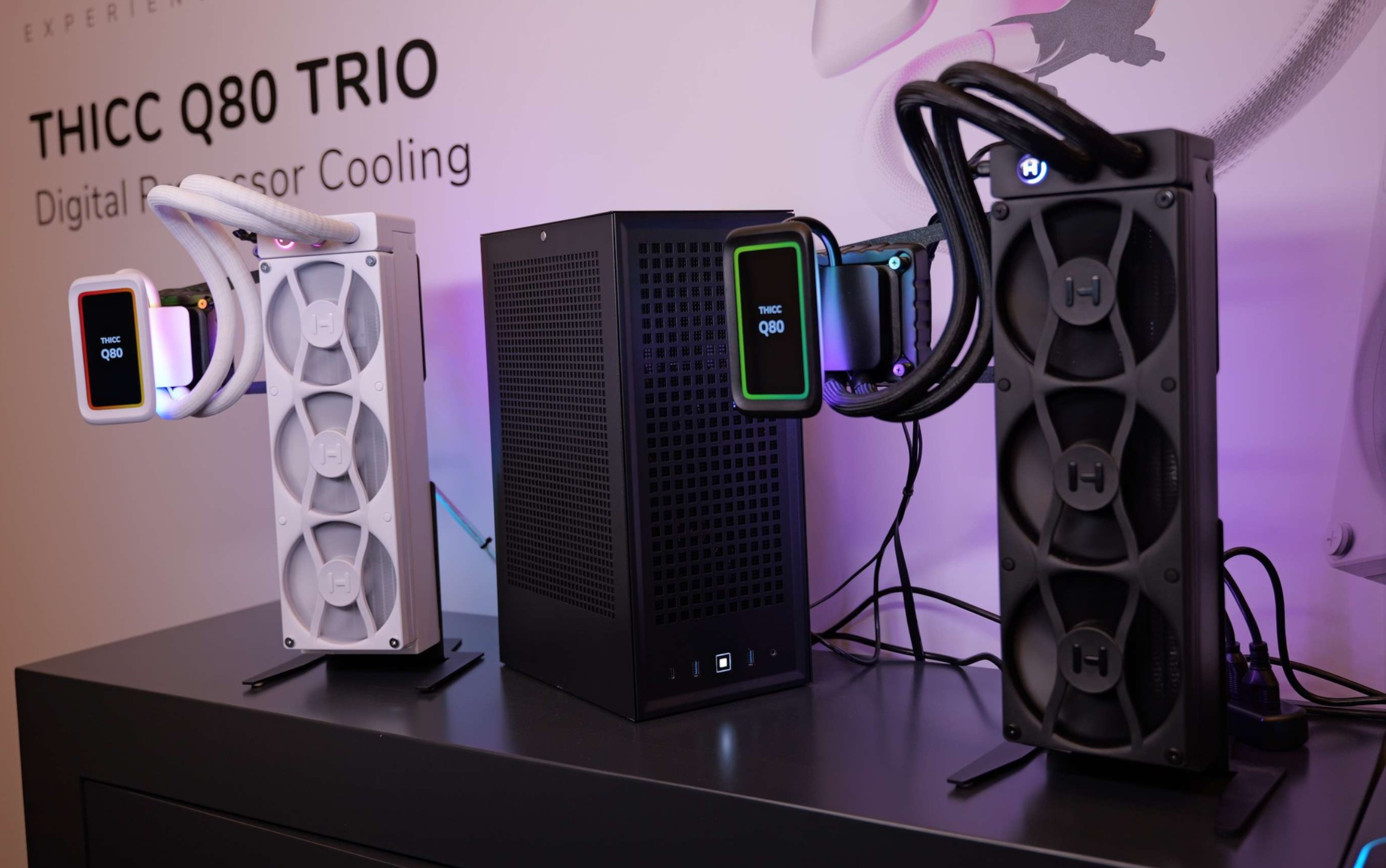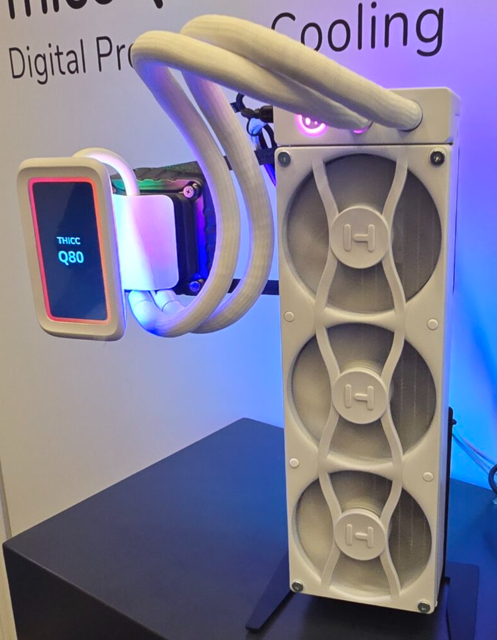 한국 시간으로 1월 7일부터 10일까지 미국 라스베가스에서 열리고 있는 CES 2025 박람회에서 미국의 대표 PC 하드웨어 브랜드 중 하나인 HYTE는 곧 출시를 앞둔 다양한 신제품들을 공개했다. 가장 먼저 눈길을 끄는 신제품은 THICC Q80 TRIO 일체형 수랭쿨러로 작년에 240mm 라디에이터 모델로 먼저 선보였던 THICC Q60 이후 드디어 360mm 라디에이터 모델을 출시 앞두고 있다. 색상은 이번에도 화이트와 블랙 2가지로 출시되며, 라디에이터 크기를 제외하면 외형적인 디자인은 동일하지만, 일부 차이가 있다. 일단, 워터블록의 5인치 디스플레이 크기는 동일하지만, 180도까지 회전이 가능해졌으며, 360mm 라디에이터 크기를 가졌기때문에 자사의 Y70 케이스에만 장착이 가능하고, 타사 일부 PC케이스에서도 장착이 가능하다. 또한, RGB 지원 방식이 메인보드 ARGB와 연동될 수 있게 변경되었고, 출시가는 319.99달러로 현재 사전예약을 받고 있다.