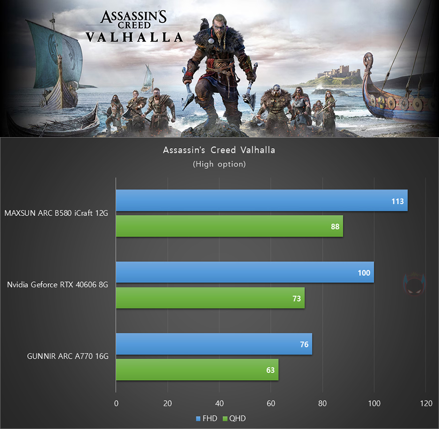 이번엔 DirectX 12기반의 게임 벤치마크를 통해 성능을 확인해 보는데, 앞서 3DMark에서 확인했듯이 ARC B580은 FHD와 QHD 해상도에서 가장 좋은 결과를 보여줍니다. 그래서, 게임 벤치마크에서도 역시 높음(High) 옵션으로 통일하고, FHD와 QHD 해상도에 따라 프레임 결과를 확인해 봤습니다. 최신 게임에서는 MAXSUN Arc B580 iCraft 12G이 가장 앞서는 결과를 보여줬으며, 출시한지 꽤 된 게임들에선 ARC A770보다 앞서는 결과를 보여줬습니다. 인텔이 드라이버 업데이트를 통해 꾸준히 ARC 그래픽 성능을 올리고 있는 점을 고려하면, 최신 게임에서는 발 빠르게 적용되고 있는 반면, 오래된 게임에서는 아직 최적화 성능이 적용되지 않았다고 짐작할 수 있습니다.