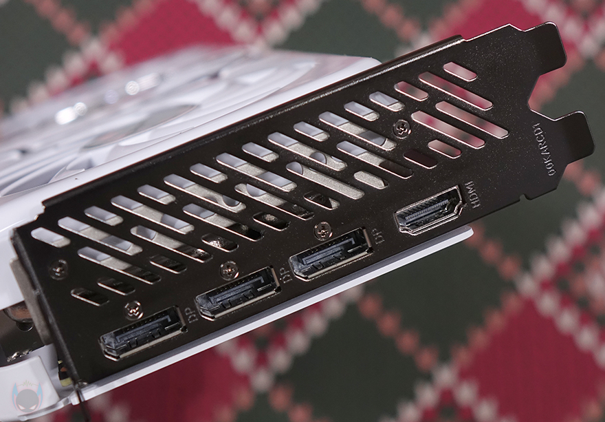 메인보드와 결착하는 슬롯부분에는 보관 시 슬롯 부식 방지 및 먼지 유입 방지를 위해 덮개를 제공해주고 있으며, 외부 쪽 그러니깐 모니터 출력 포트 부분에서 보면 슬롯 높이가 딱 2-슬롯(Slot) 임을 확인할 수 있습니다. 그리고, 모니터 출력 포트에도 모두 사용하지 않는 포트는 부식 방지 및 먼지 유입방지를 위해 마개를 제공해주고 있으며, 출력 포트에는 DP(Display Port) 3개, HDMI 포트 1개를 구성하고 있습니다. 참고로, DP포트는 2.1 버전, HDMI는 2.1a 버전입니다.