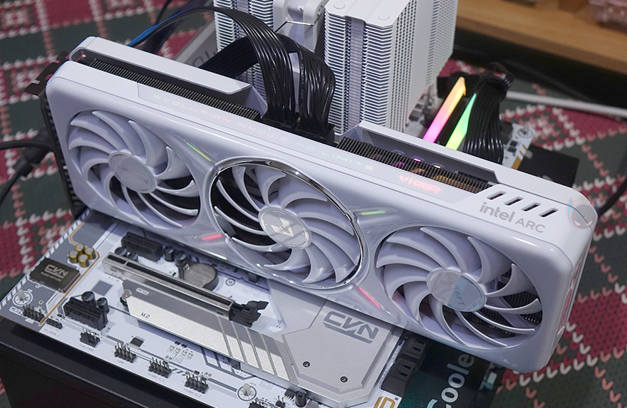 이제, MAXSUN(맥선) Arc B580 iCraft 12G 그래픽카드의 성능을 확인해보는데, 시스템 기반은 AMD Ryzen 7 7800X3D이며, 그래픽카드 드라이버 버전은 최신 버전으로 적용했습니다. 그리고, 성능에 앞서 그래픽카드에 전원이 들어오면 앞서 언급했듯이, 쿨러 가운데 팬 주변과 측면에서 RGB 라이트닝 효과를 확인할 수 있는데, 따로 설정을 지원하지 않고, 숨쉬기 모드로만 작동합니다.