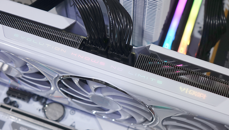 그럼, 본격적으로 MAXSUN(맥선)의 Arc B580 iCraft 12G 그래픽카드를 살펴보는데, 디자인은 화이트 콘셉트의 쿨러를 장착하고 있으며, 쿨러에는 90mm 크기의 팬이 3개 장착되어 있습니다. 각 팬에는 총 11개의 날개(Blade)가 적용되어 있으며, 가운데 팬은 테두리부분에 좀 더 포인트를 주는 실버-링 디자인을 적용하고 있죠. 또한, 쿨러 표면은 유광처리로 세라믹 질감의 Daylight-glow 코팅을 적용했으며, 뒤에서 확인하겠지만, 작동 시 가운데 팬 주변으로 X자 형태로 약간 오목하게 들어간 부분은 RGB 라이트닝 효과를 보여줍니다. 그리고, 쿨러 바깥쪽 측면에는 일단 개봉 시 보호비닐이 부착되어 있어서 보호비닐들을 제거해줘야 하며, 역시 뒤에서 확인하겠지만, 측면 가운데 라인으로도 RGB 라이트닝 효과를 적용하고 있죠. 이 밖에 측면 맨 오른쪽에는 Intel ARC와 iCraft 로고를 표시해 놨으며, 보조전원은 8(6+2) 핀 2개가 적용된 것을 확인할 수 있습니다.