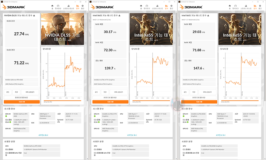 성능은 시작에서 언급했듯이 ARC B580은 ARC 등급에서 중간 즉 메인스트림급에 속하기때문에 소비자들이 많이 선택하는 Nvidia의 RTX 4060과 이전 세대인 ARC A770과 비교를 해봤습니다. 먼저, 3DMark 프로그램을 통해 각 항목별 벤치마크 테스트 결과를 확인해 보면, DirectX 11 기반의 Fire Strike에선 기본/익스트림/울트라 모두 MAXSUN Arc B580 iCraft 12G가 가장 좋은 결과글 보여줬습니다. 특히, 이전 세대인 ARC A770이 RTX 4060과 비슷한 성능이었던 상황에서 이제는 ARC B580이 훨씬 앞서는 상황이 되었죠. DirectX 12 기반의 Time Spy에서도 역시 MAXSUN Arc B580 iCraft 12G가 가장 앞서는 결과를 보여줬으며, 하이엔드 PC 환경으로 테스트하는 Steel Nomad에서도 가장 앞서는 결과를 보여줬습니다. 유일하게 앞서지 못한 항목은 Speed Way였습니다. 그리고, 각 그래픽카드 회사들이 적용하는 업스케일링 결과도 ARC B580이 가장 크게 향상되는 걸 확인할 수 있습니다.