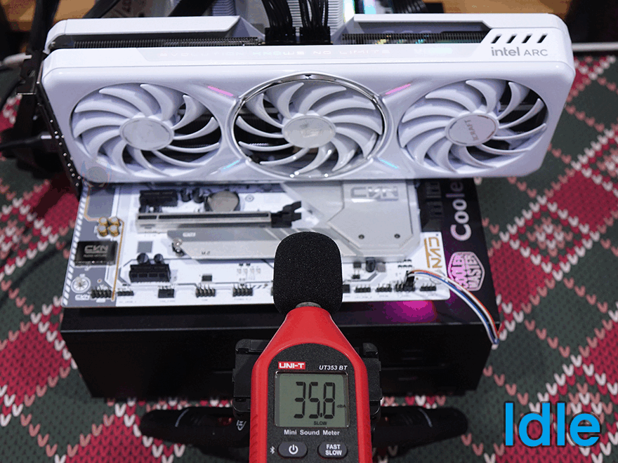 끝으로, MAXSUN Arc B580 iCraft 12G 그래픽카드의 쿨링 성능을 확인해보는데, 그전에 그래픽카드에 장착된 쿨러 같은 경우 일정 온도에 도달하기 전까지는 무소음으로 팬이 작동하지 않는 일명 제로팬 기술이 적용되어 있습니다. 그래서, 팬이 주로 작동하지 않는 Idle 상황에선 CPU 쿨러와 파워서플라이의 팬 소음만 측정되고, 과부하의 Load 상황에서 팬 소음은 약 40dB로 과부하상태에서도 그래픽카드 쿨러의 소음이 매우 정숙한 편임을 확인할 수 있죠. 그리고, Furmark 프로그램을 통해 10분간 과부하 시 최대 온도도 62℃로 낮은 편임을 확인할 수 있어서 쿨러 성능이 전체적으로 상당히 좋다는 걸 알 수 있습니다.