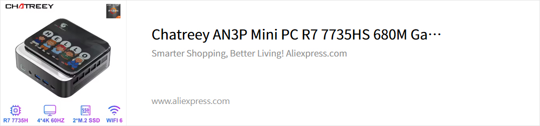 CHATREEY는 알리에서 미니PC 좀 알아봤다면 가장 많이 볼 수 있는 브랜드 중 하나이고, 이미 국내 소비자들에게도 잘 알려진 브랜드 중 하나이다. 특히, CHATREEY 브랜드를 알린 대표적인 미니PC가 AN2P인데, 이번에 드디어 후속 모델로 AN3P 미니PC가 나왔다. 이번 AN3P는 AMD 라이젠 7 7735H CPU를 탑재하고 있어서, 이전 AN2P보다 월등히 성능이 높아졌으며, 내장그래픽 성능도 높아져 게임을 즐기기에도 더 원활해졌다. 물론, No RAM, No Storage인 베어본 옵션부터 구매할 수 있으니, AN2P 후속을 기다리고 있었다면, 이번에 미리 챙겨놓자. 곧 피스커뮤를 통해서도 리뷰로 만나볼 수 있다.