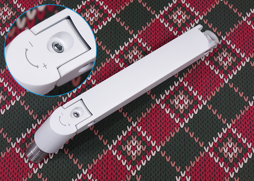 그럼, 본격적으로 실버스톤(Silverstone) ARM14 모니터암(Monitor arm)을 살펴보는데, 일단 색상은 시작에서 언급했듯이 실버스톤 모니터암 처음으로 화이트(White)와 블랙(Black) 2가지 색상으로 출시했습니다. 그리고, 개봉 시에는 상부암(Top arm)과 하부암(Bottom arm)으로 분리되어 있으며, 상하를 연결하는 홈에 맞춰서 조립 후 사용해야 합니다. 리뷰에선 화이트 색상으로 살펴보고, 상부암부터 살펴보는데, 상부암에는 -/+ 표시로 모니터 높낮이조절을 할 수 있는 장력부가 있습니다. 그리고, 상부암 아랫부분에는 케이블 정리 및 가릴 수 있는 커버가 장착되어 있죠. 슬라이드 방식으로 분리/장착할 수 있습니다.