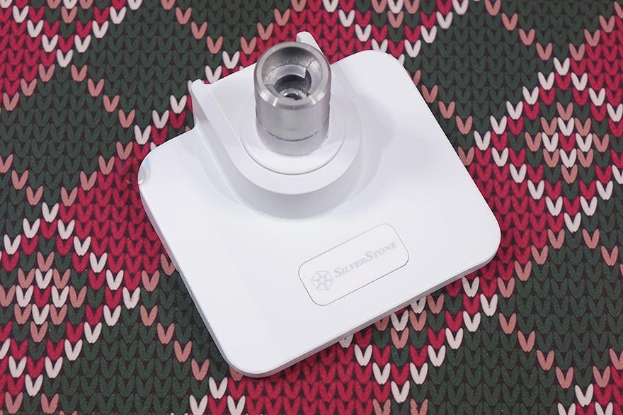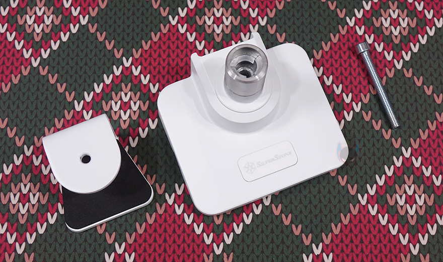 그리고, 하부암 아래 홈과 연결되는 클램프를 살펴보면, 클램프 받침대 앞부분에 실버스톤 로고를 새겨놨으며, 양쪽 측면으로는 별도의 USB 케이블을 구매하면 포트 구성을 할 수 있게 커버가 적용되어 있습니다. 참고로, 여기에 사용할 수 있는 USB 케이블은 국내시장에서도 쉽게 구입할 수 있습니다. 그리고, 받침대 후면에는 뒤에서 확인하겠지만, 케이블 홀더를 끼울 수 있게 홈처리가 되어 있죠. 또한, 받침대 밑바닥 부분에는 고정 클램프가 들어가는 구멍과 함께 모서리 부분으로 패드를 부착해 놨으며, 방금 언급한 양쪽 USB 커버도 나사를 풀면 분리할 수 있습니다.